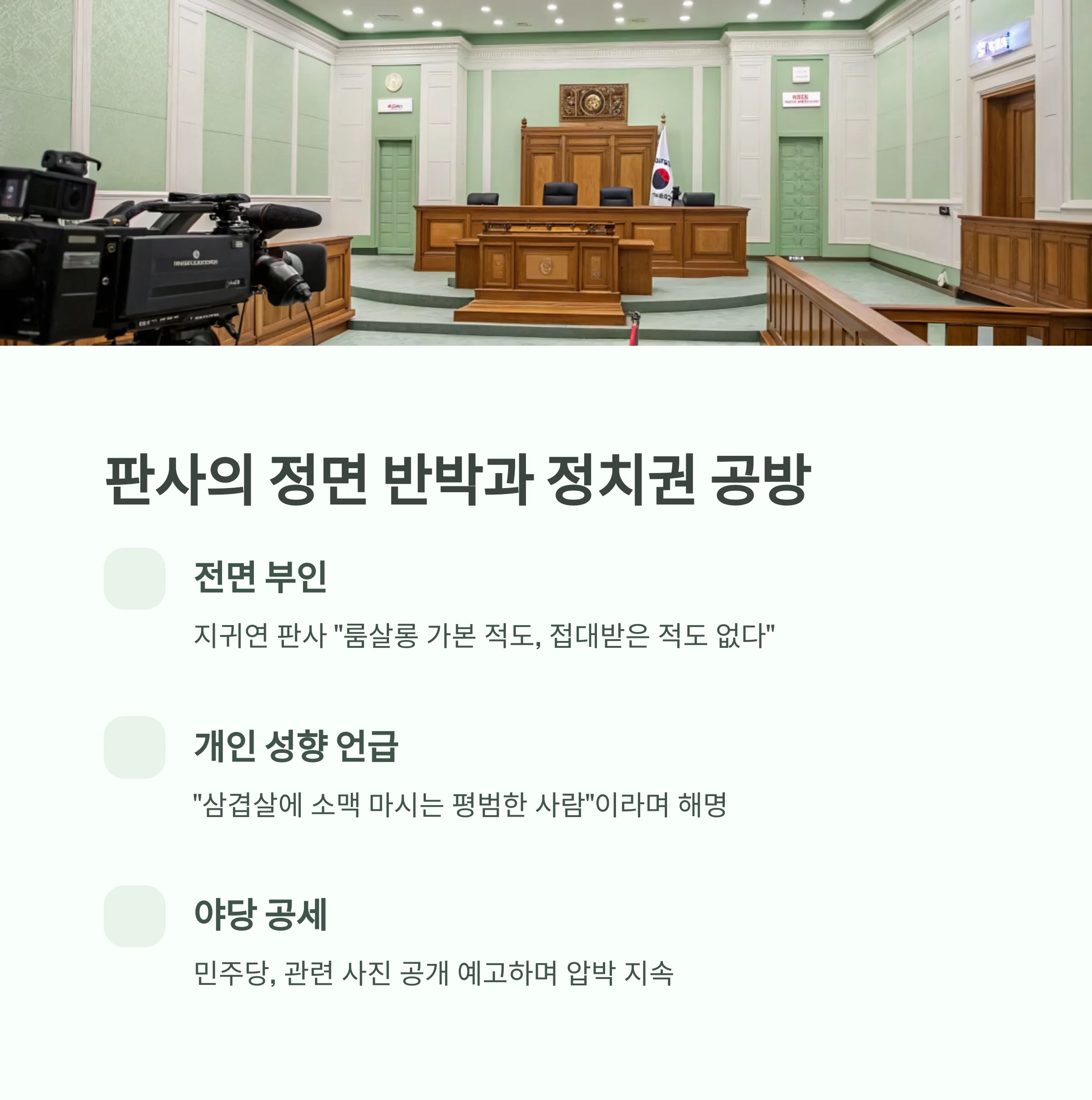 지 판사는 2025년 5월 19일 재판에 앞서 “그런 곳에 가본 적도, 접대받은 적도 없다”며 직접 해명했고,