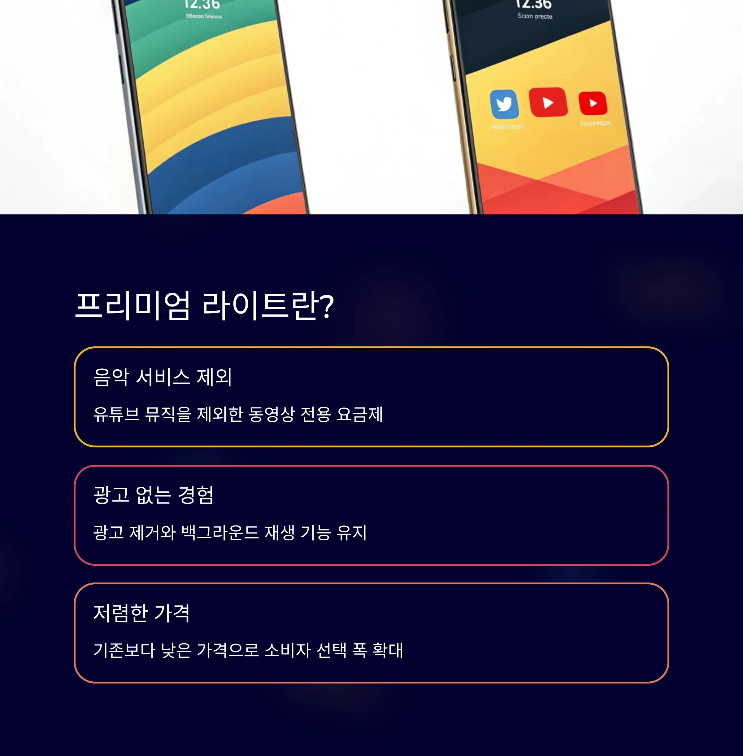 기존 유튜브 프리미엄에서 음악 스트리밍 서비스인 유튜브 뮤직을 제외한 상품으로,