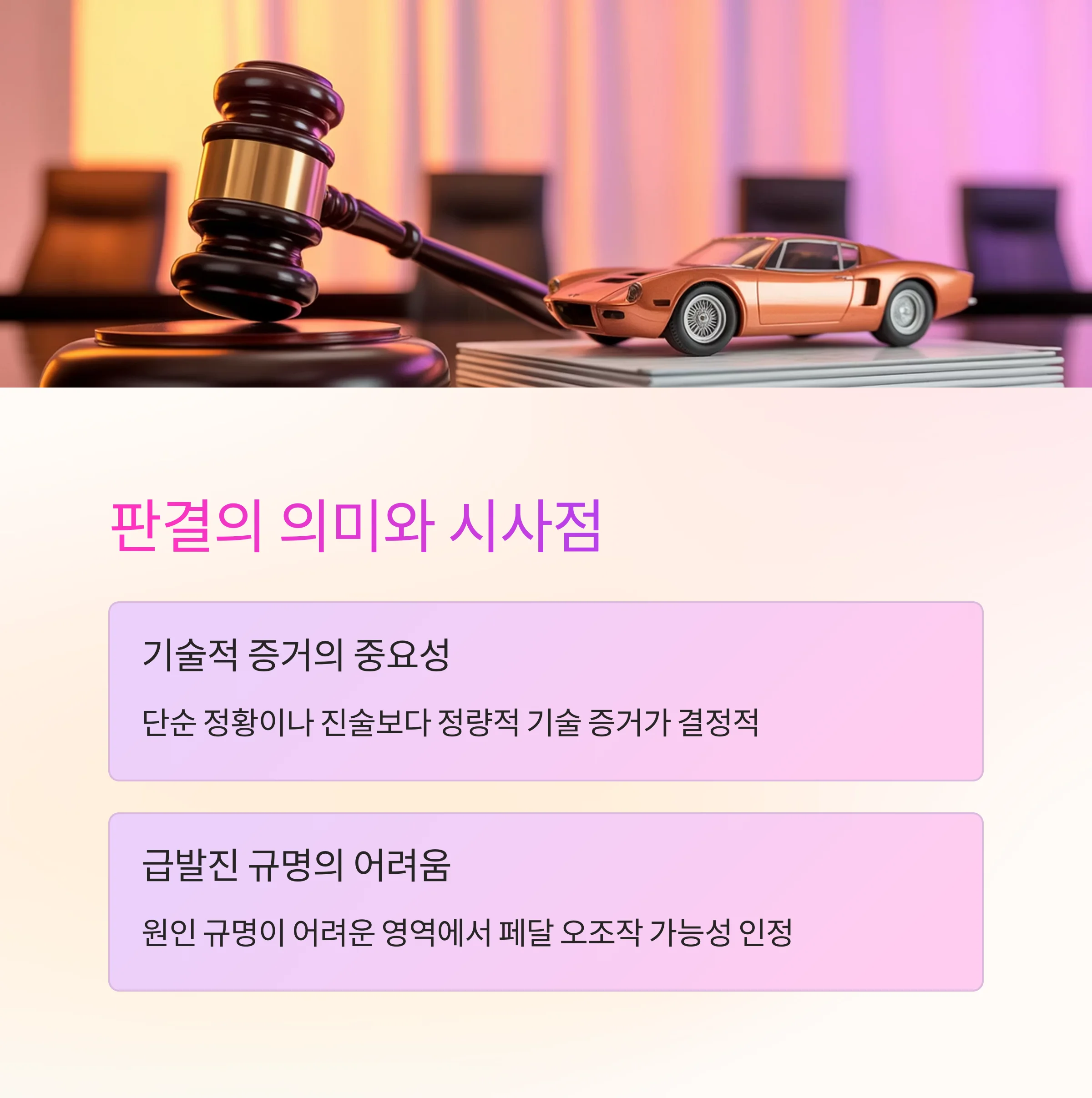 이번 판결은 차량 제조사의 책임을 묻기 위해서는 단순한 사고 정황이나 운전자 진술이 아닌,