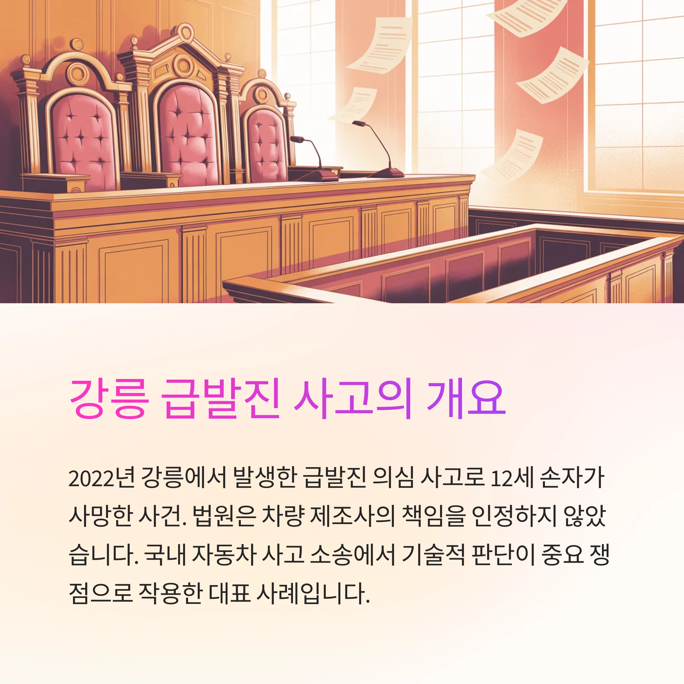 2022년 강릉에서 발생한 차량 급발진 의심 사고로 12세 손자가 사망한 사건에 대한 손해배상 청구 소송에서, 법원은 차량 제조사의 책임을 인정하지 않았습니다.