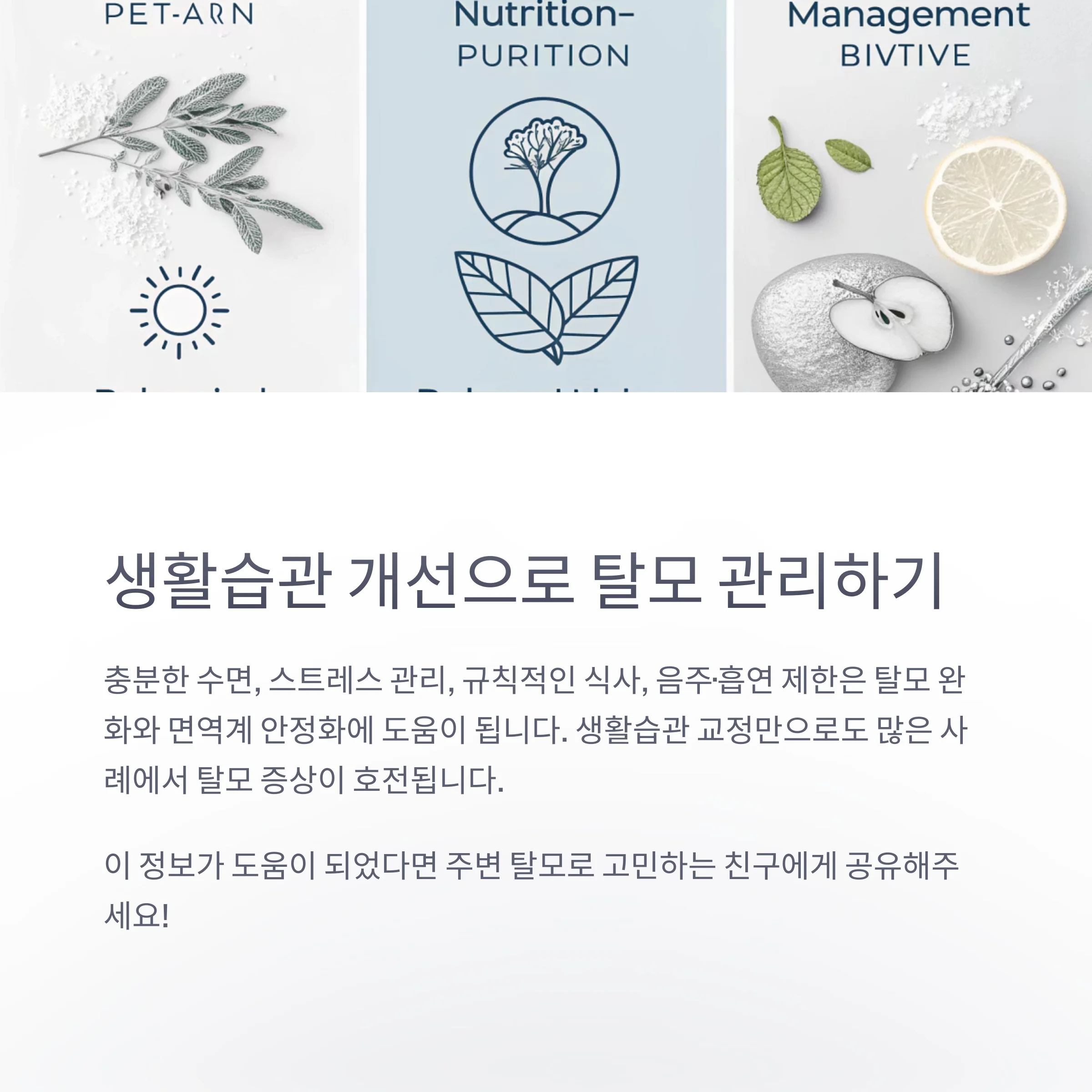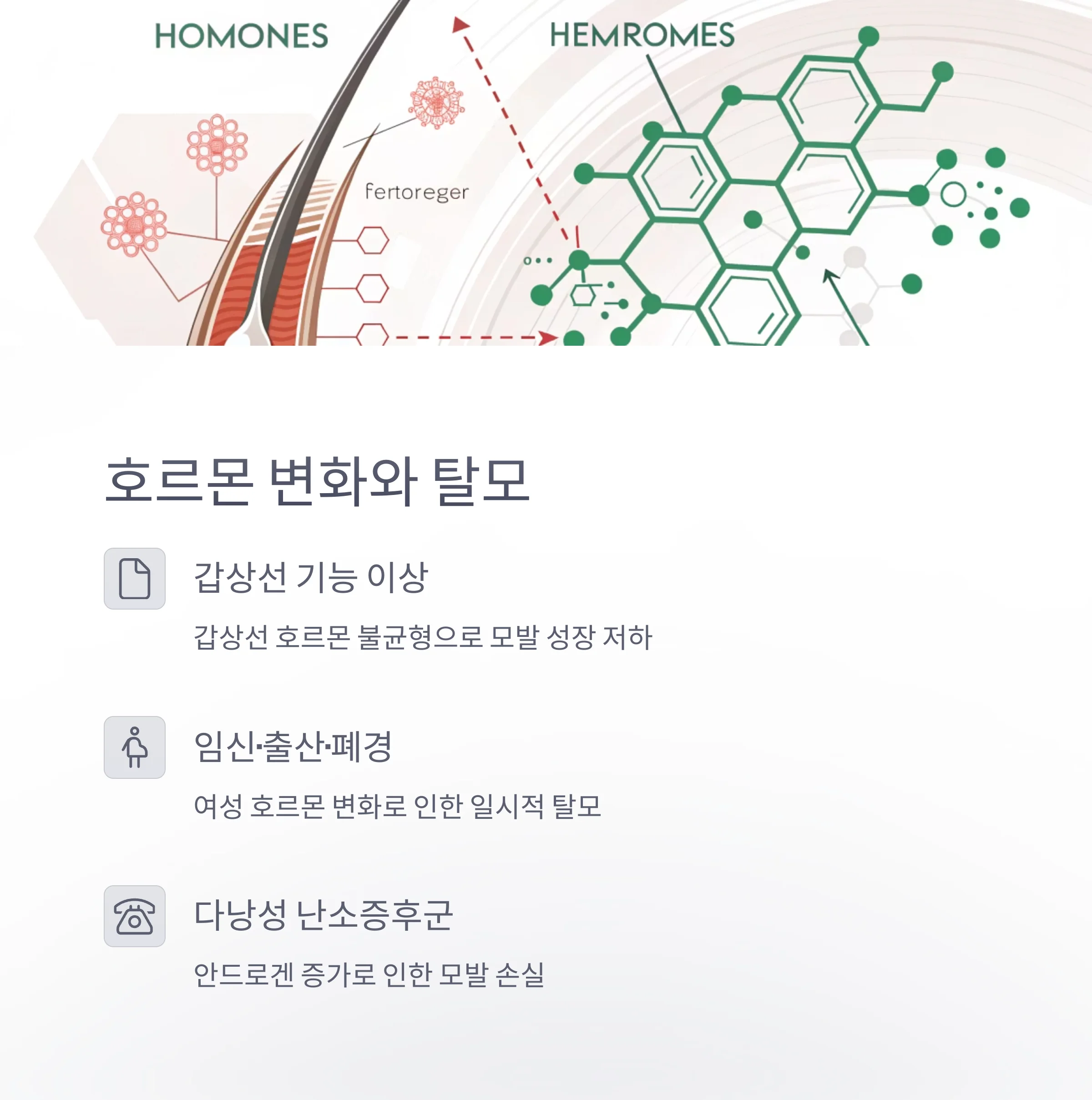 | 스트레스, 면역 | 원형탈모, 휴지기 탈모, 자가면역 반응 등 |