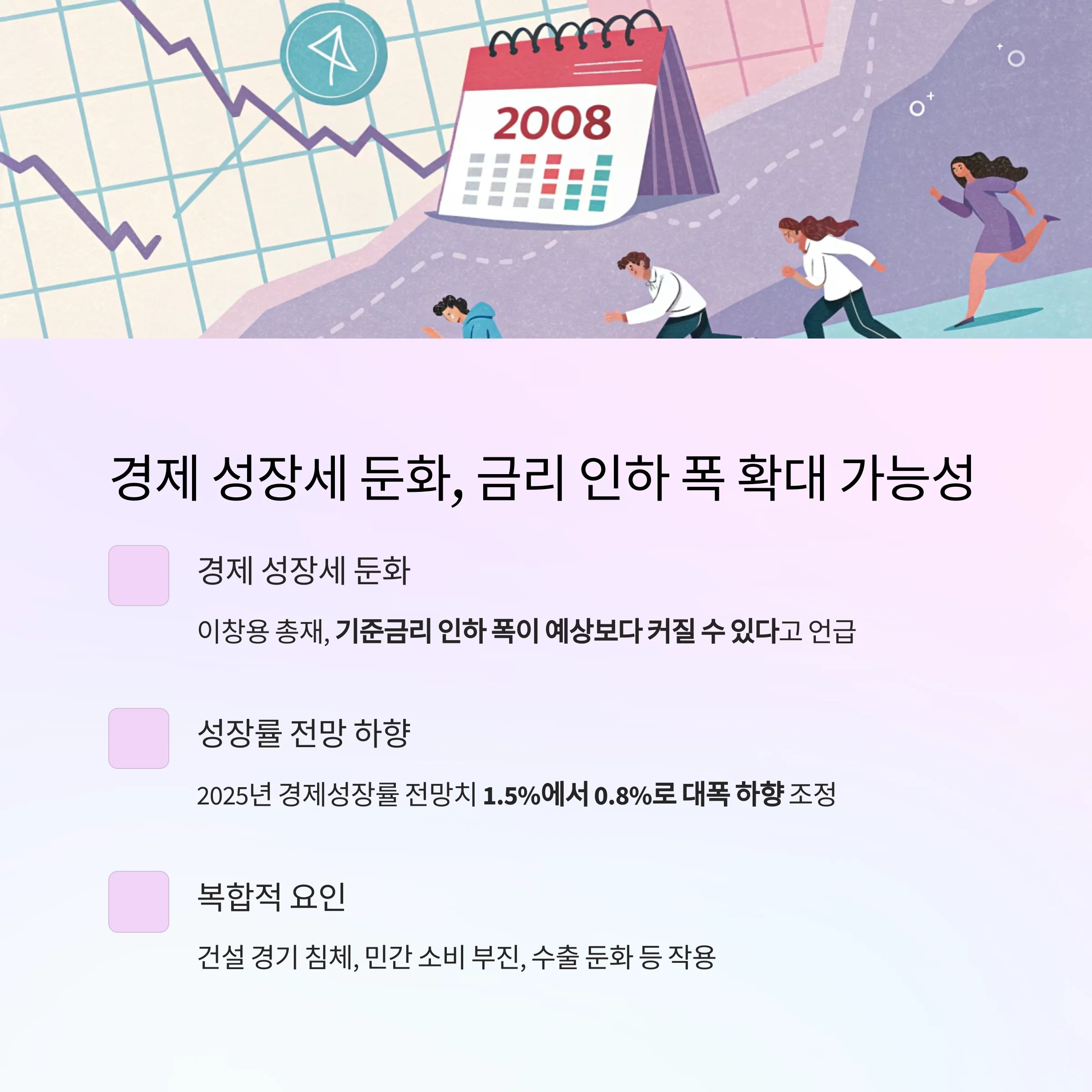 | 금리 인하 폭 | 예상보다 커질 수 있음 | 경제성장률에 연동 조정 |