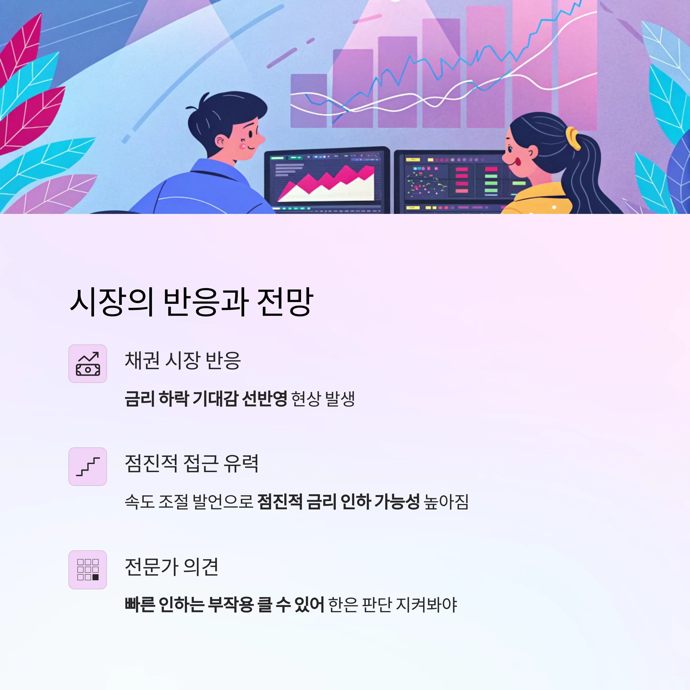 그러나 속도 조절 발언으로 인해 즉각적인 대규모 금리 인하보다는 점진적인 접근이 유력해 보입니다.