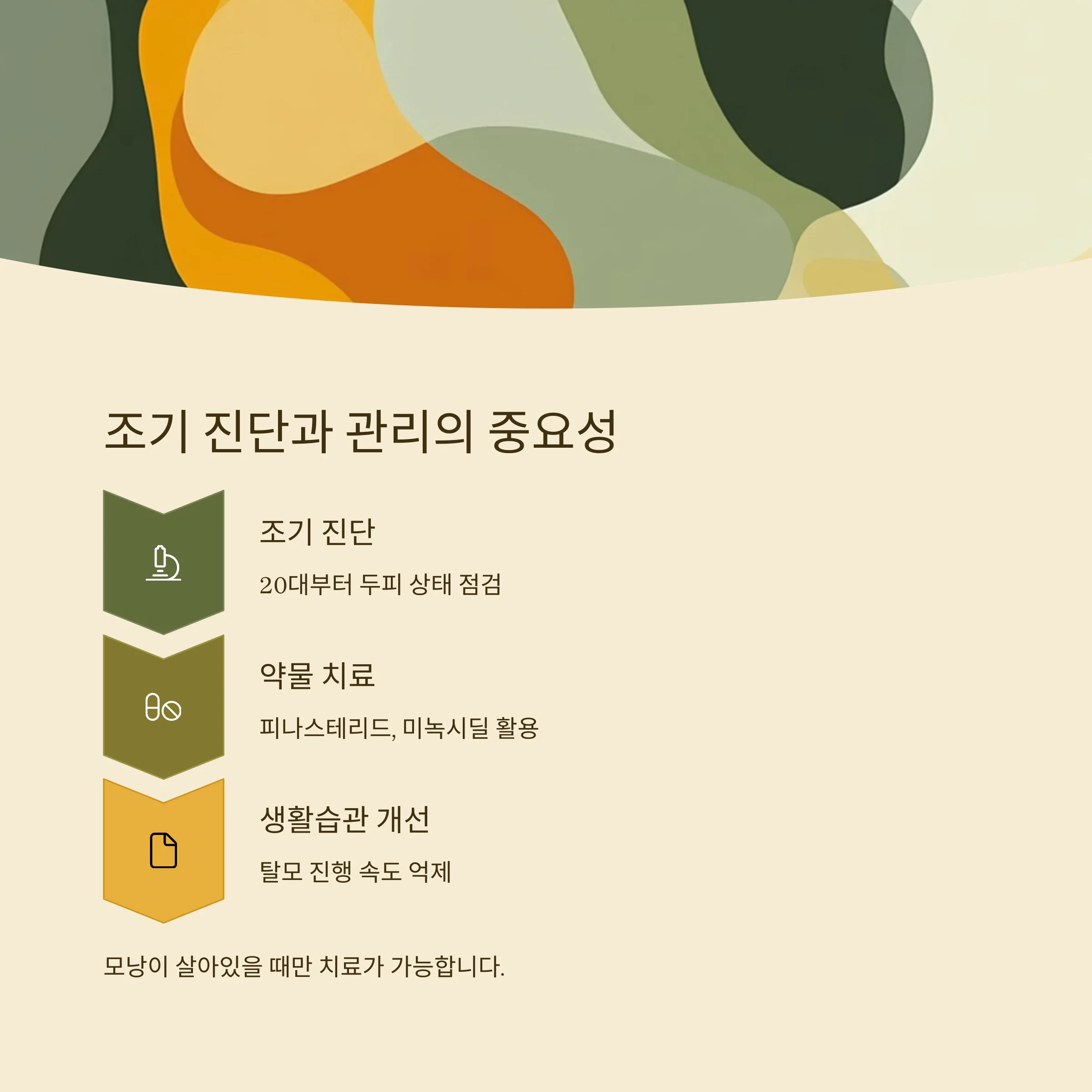 초기 대응으로 탈모 속도 조절, 증상 억제, 외모 변화 최소화가 가능합니다.