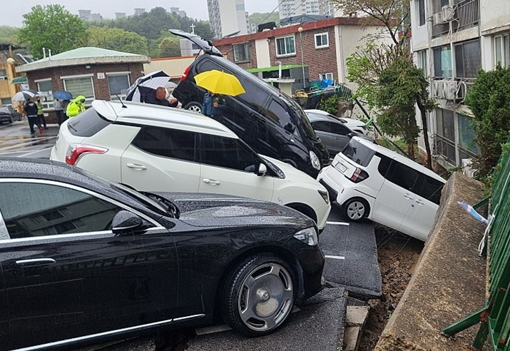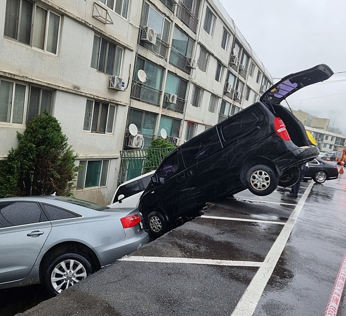 주차장 벽 아래는 단차가 있는 구조였고, 다행히도 사람이 다치지는 않았지만 차량 주인들은 그저 멍하니 무너진 주차장을 바라볼 수밖에 없었습니다.