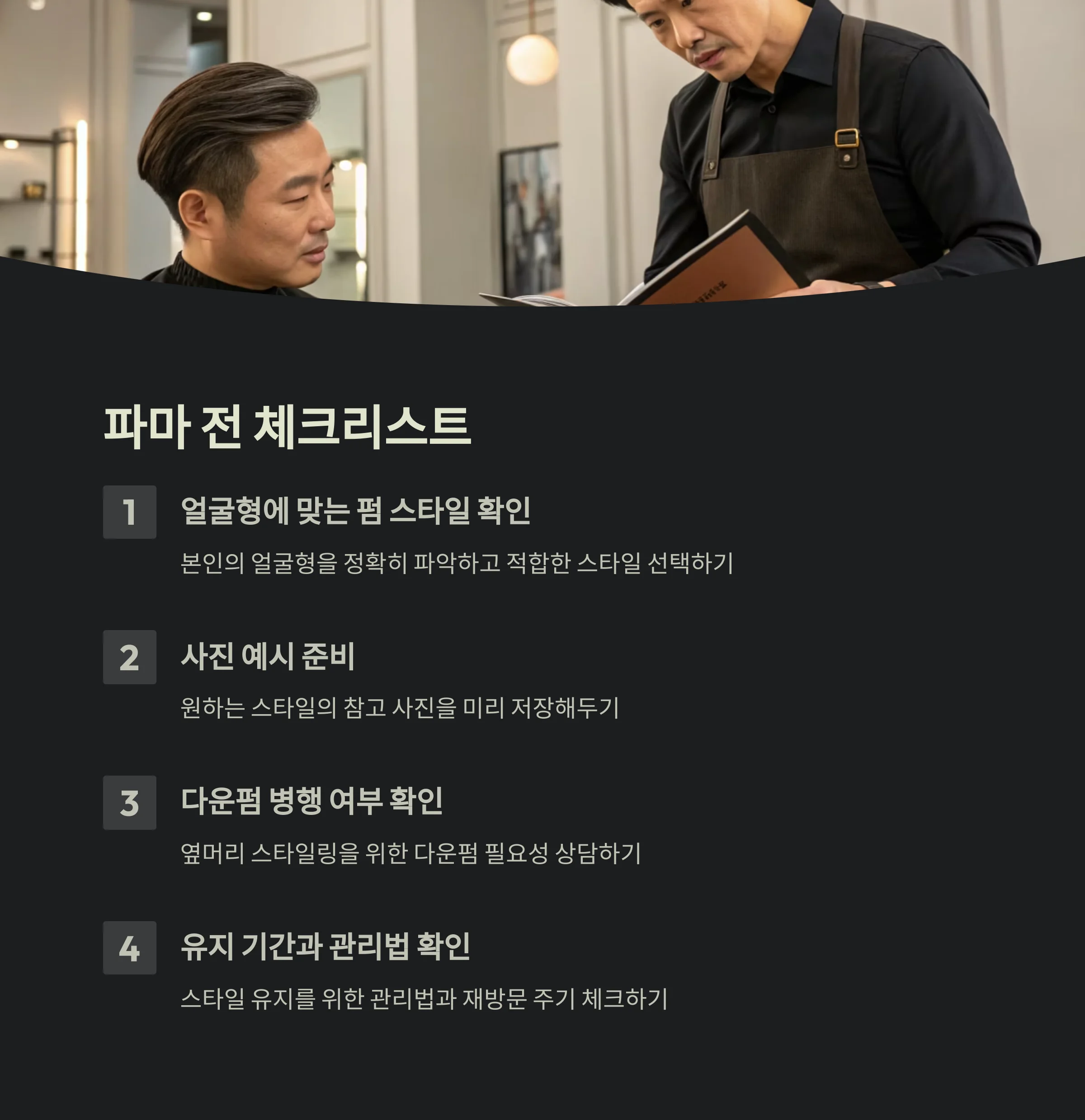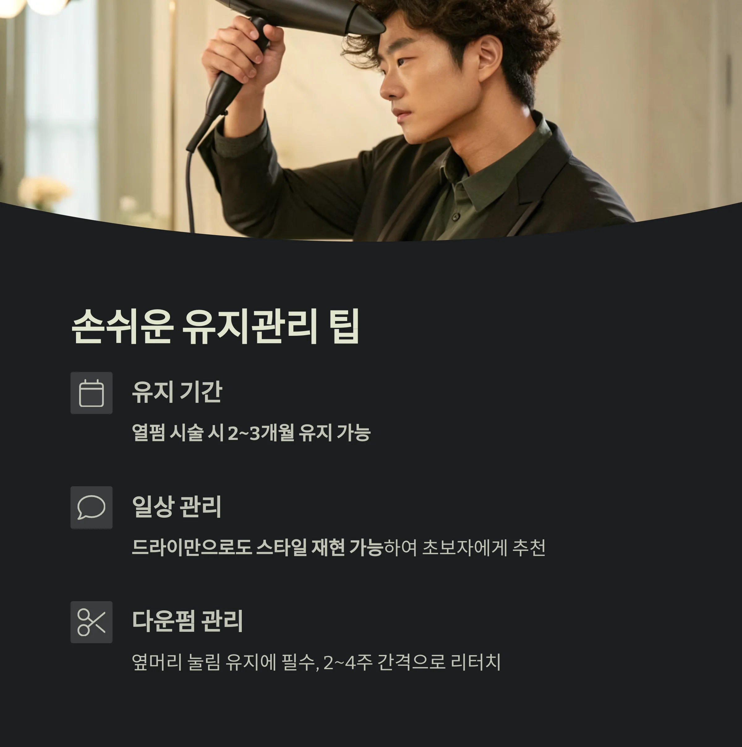 - 다운펌은 옆머리 눌림 유지에 필수, 2~4주 간격으로 리터치