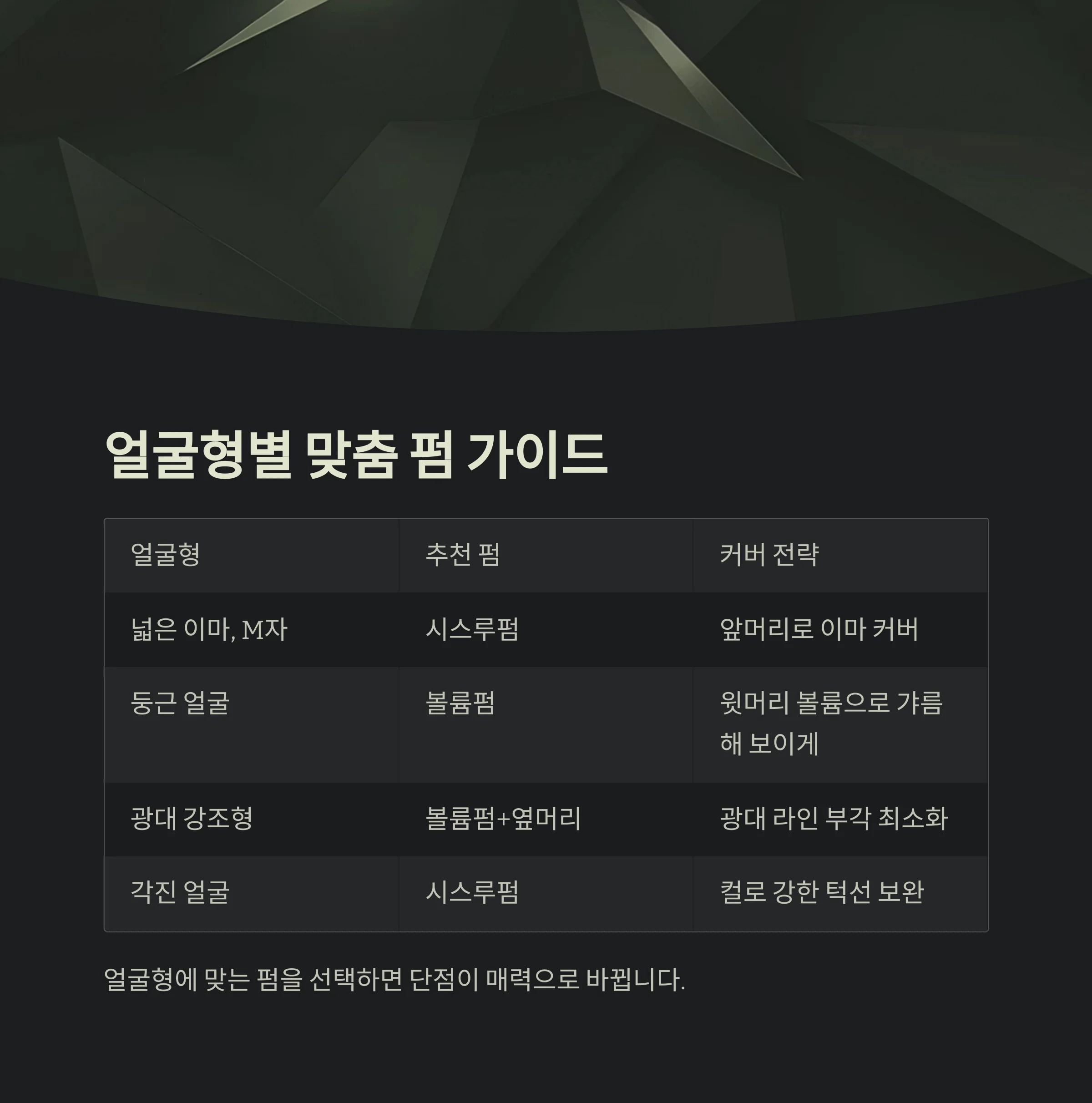 | 얼굴형 | 추천 펌 | 커버 전략 |