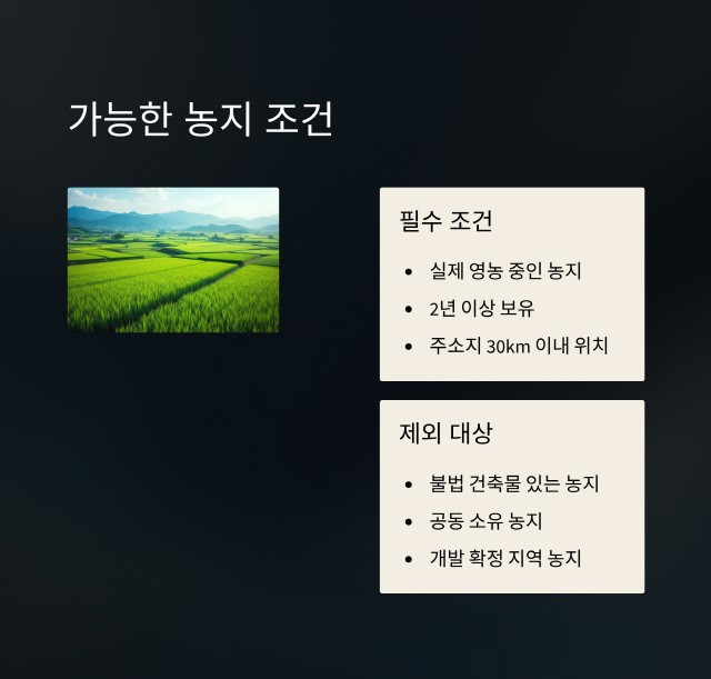 • 가입자 주소지에서 직선거리 30km 이내 또는 연접한 시·군·구에 위치한 농지.