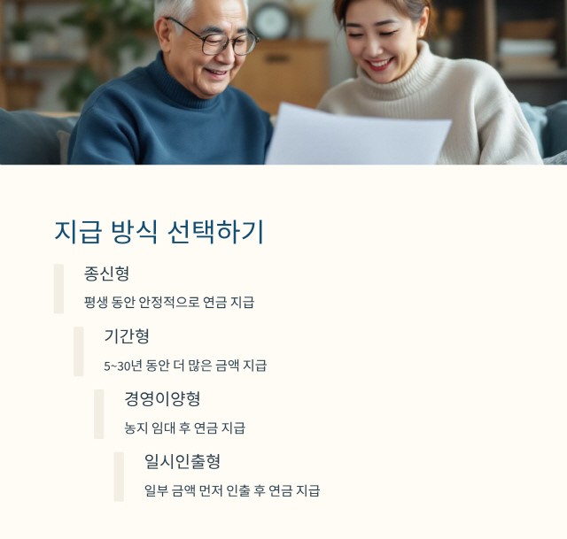 농지연금은 다양한 지급 방식이 있으며, 각 방식에 따라 월 수령액이 달라집니다: