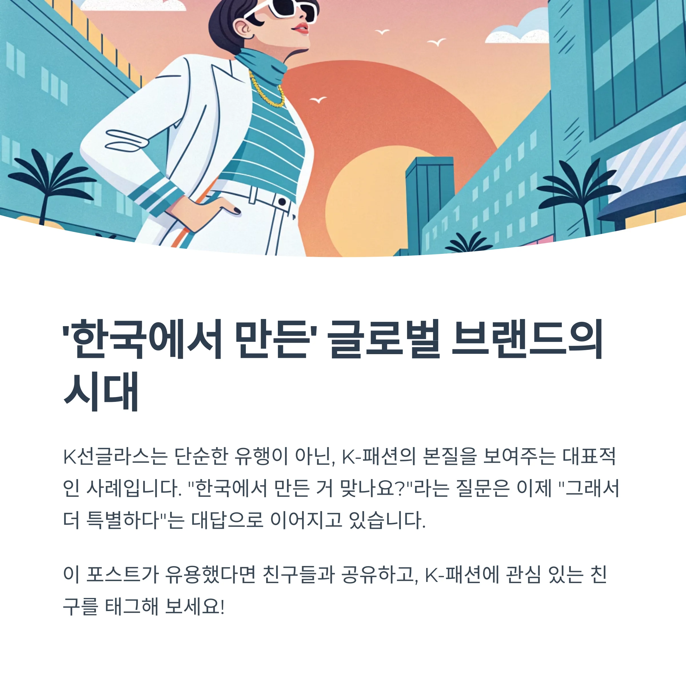 K선글라스는 단순한 유행이 아닌, K-패션의 본질을 보여주는 대표적인 사례입니다. "한국에서 만든 거 맞나요?"라는 질문은 이제 "그래서 더 특별하다"는 대답으로 이어지며, 세계 소비자들의 선택을 이끌고 있습니다.