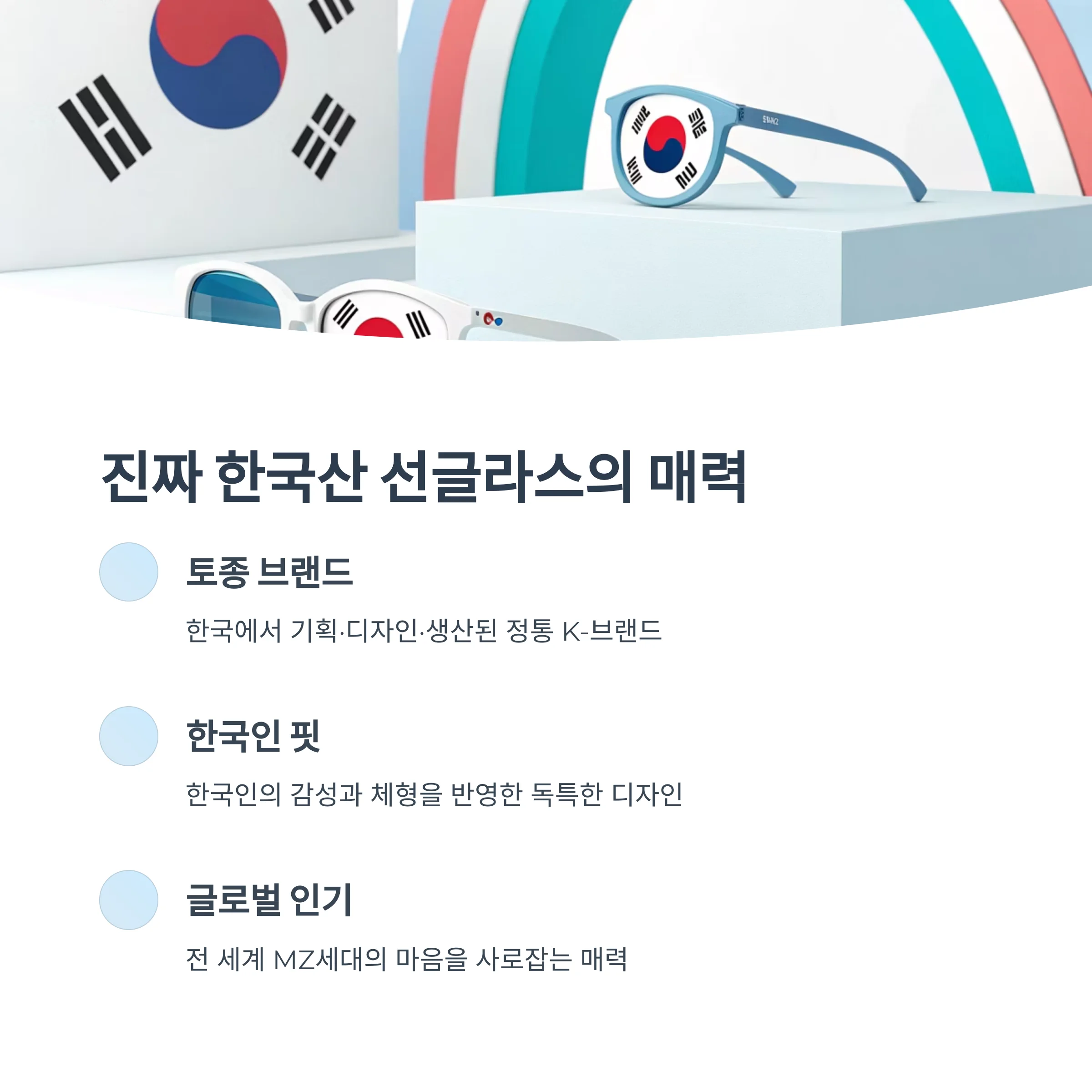‘K선글라스’가 주는 가장 큰 신뢰는 바로 그 출발점이 한국이라는 점입니다. K뷰티, K팝과 마찬가지로 K-패션의 한 축으로 자리잡은 선글라스 브랜드들은, ‘한국에서 만든 제품’이라는 정체성을 마케팅 자산으로 적극 활용하고 있습니다.