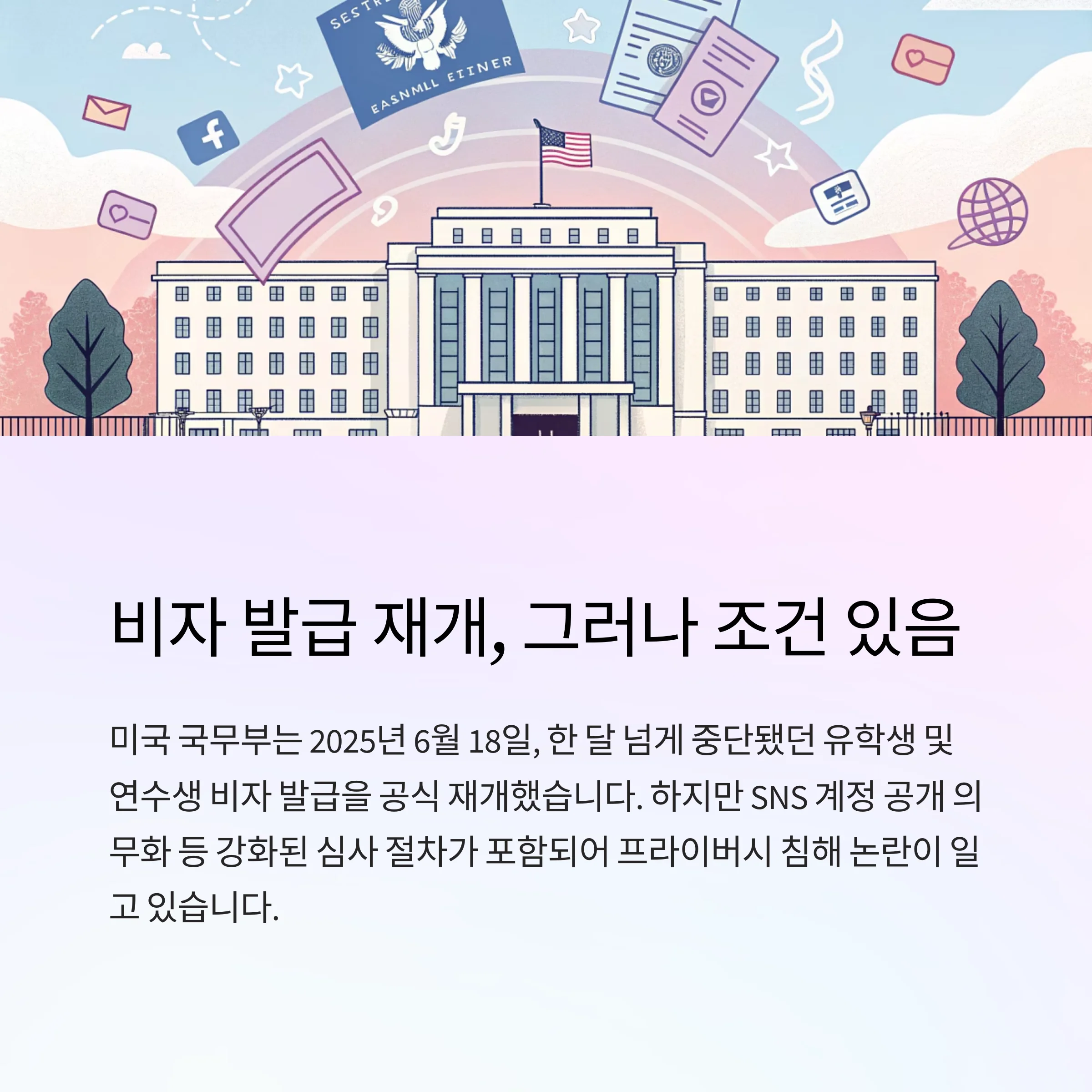미국 국무부는 2025년 6월 18일, 한 달 넘게 중단됐던 외국인 유학생 및 연수생 대상의 비자 발급을 공식 재개한다고 발표했습니다. 하지만 이번 재개 조치에는 SNS 계정 공개 의무화 등 강화된 심사 절차가 포함돼 있어, 유학생과 학부모들 사이에 우려의 목소리도 커지고 있습니다. 프라이버시 침해 및 표현의 자유 침해 논란도 함께 제기되고 있습니다.