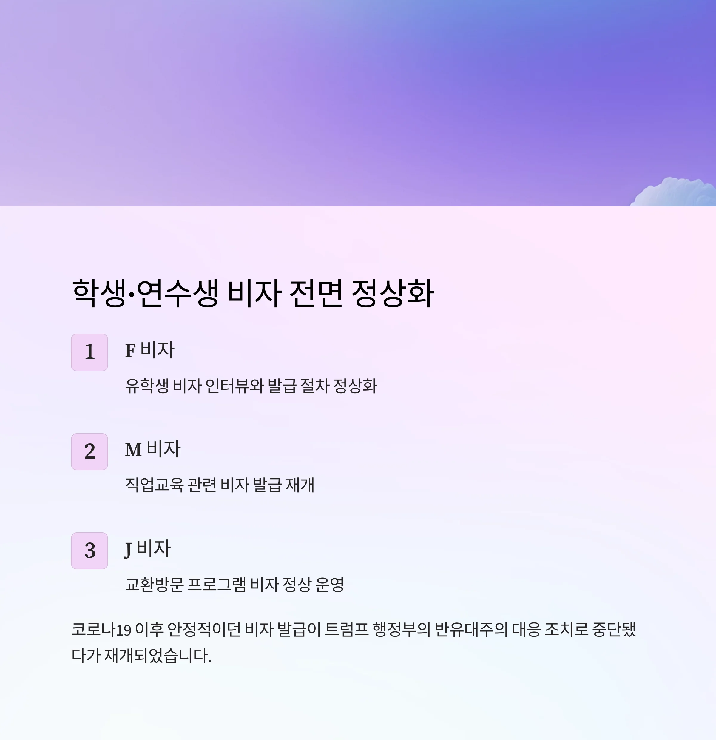 | 비자 발급 재개 | F, M, J 전면 정상화 |