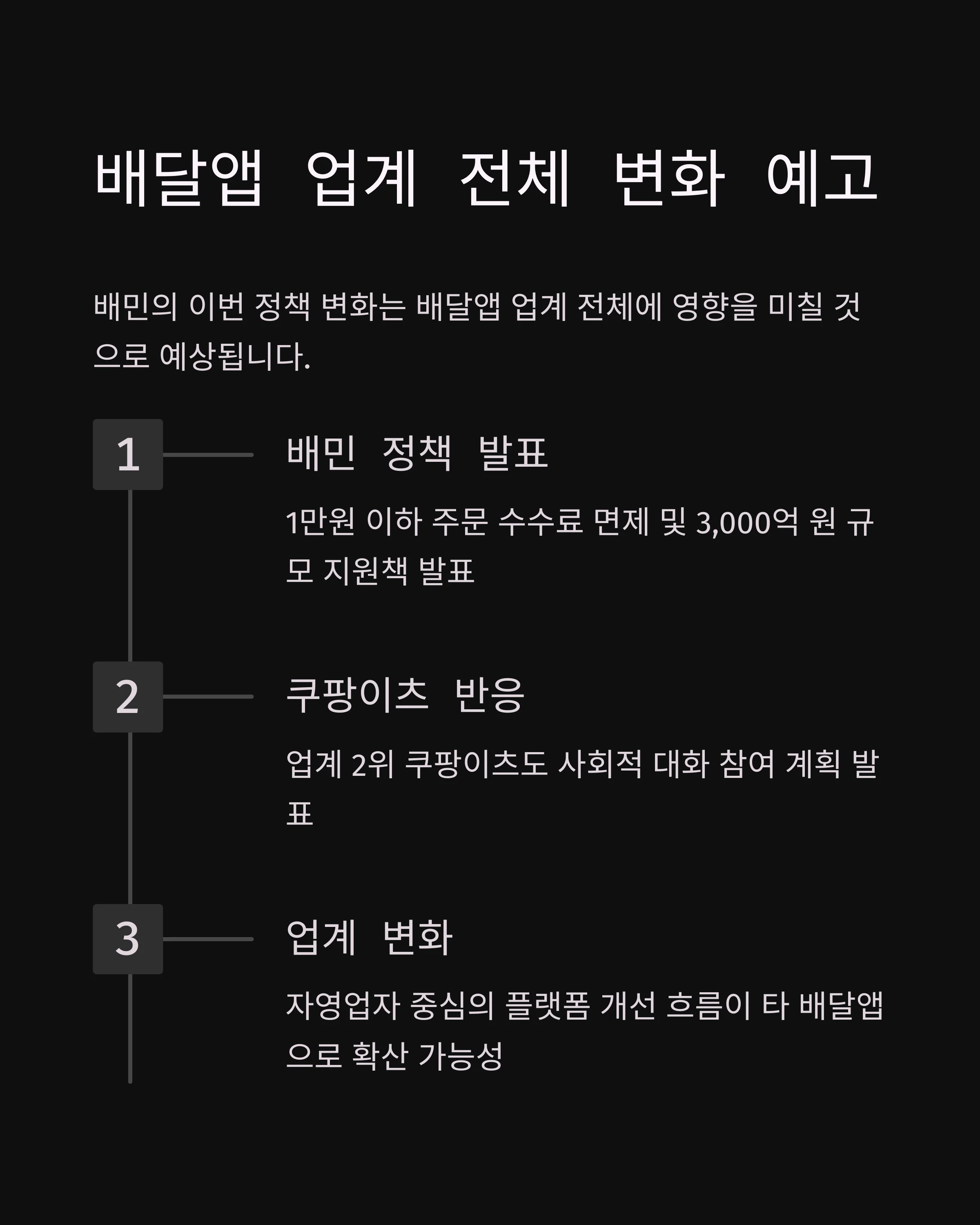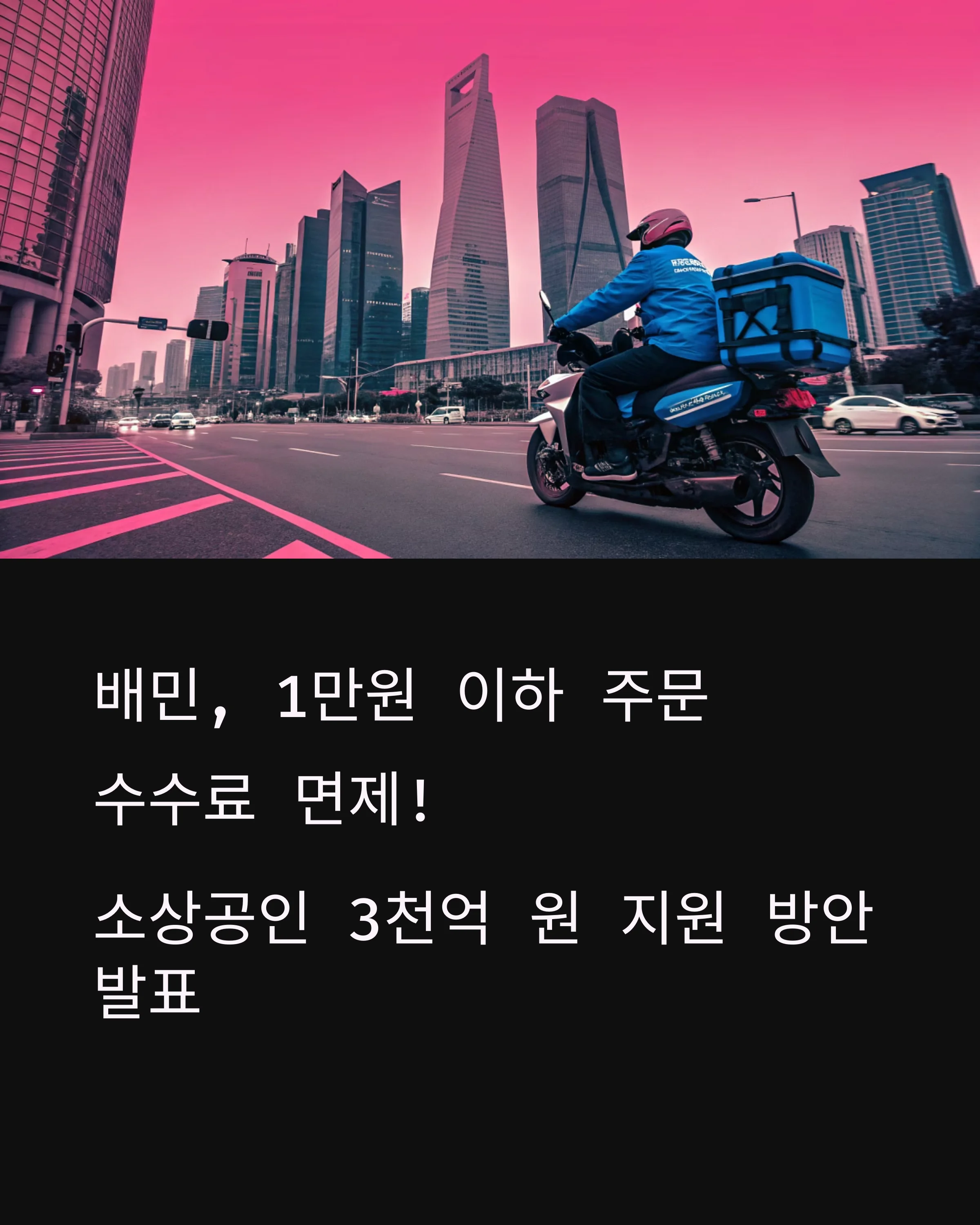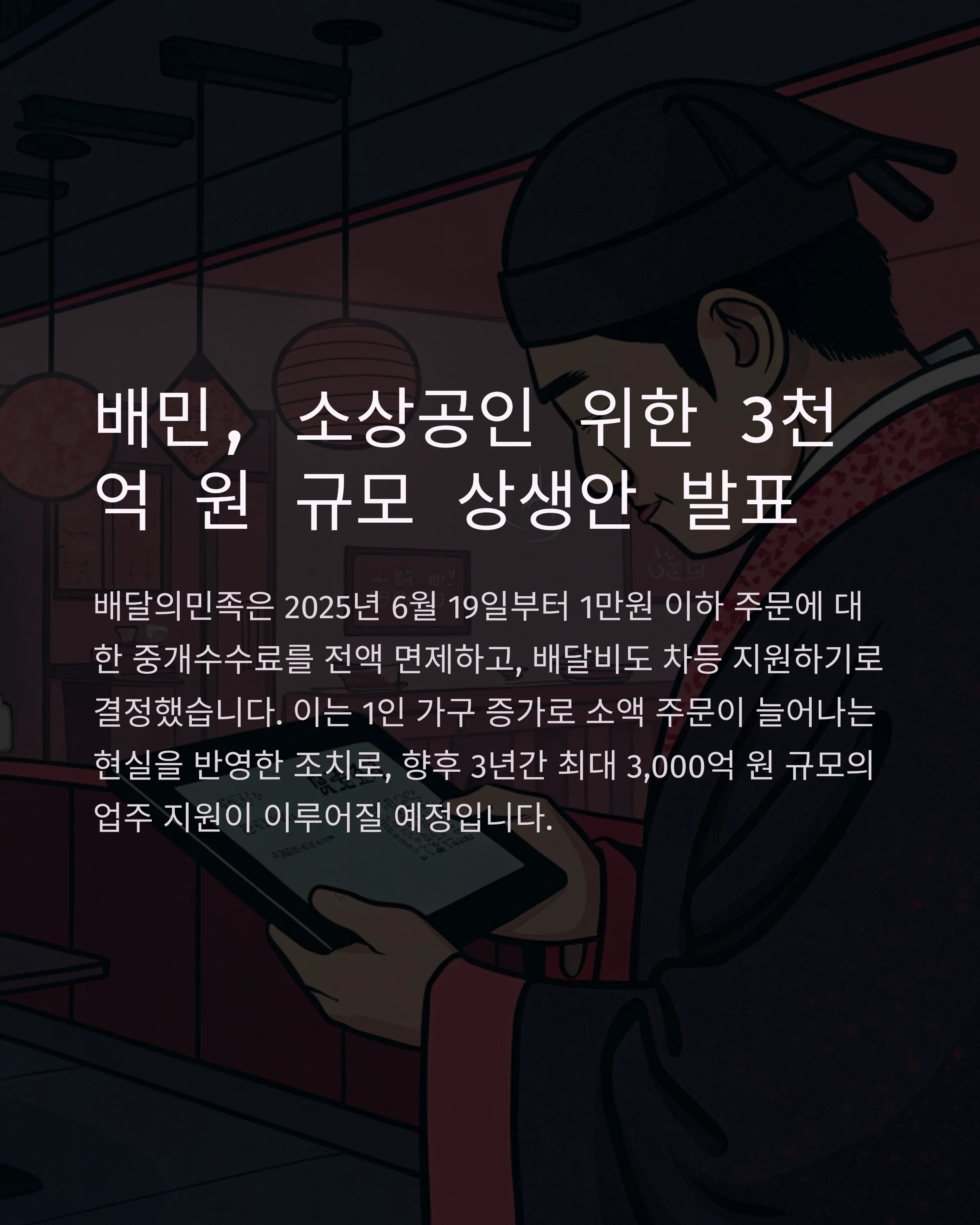 배달의민족(배민)이 2025년 6월 19일, 1만원 이하 주문 건에 대해 중개수수료를 전액 면제하고, 배달비도 차등 지원하기로 입점 업주 단체들과 합의했습니다. 1인 가구 증가로 소액 주문이 많아지는 현실을 반영해, 업주 부담을 줄이고 소비자 이용 편의를 동시에 도모하는 전략으로 풀이됩니다. 향후 3년간 최대 3,000억 원 규모의 실질적인 업주 지원이 이뤄질 예정입니다.