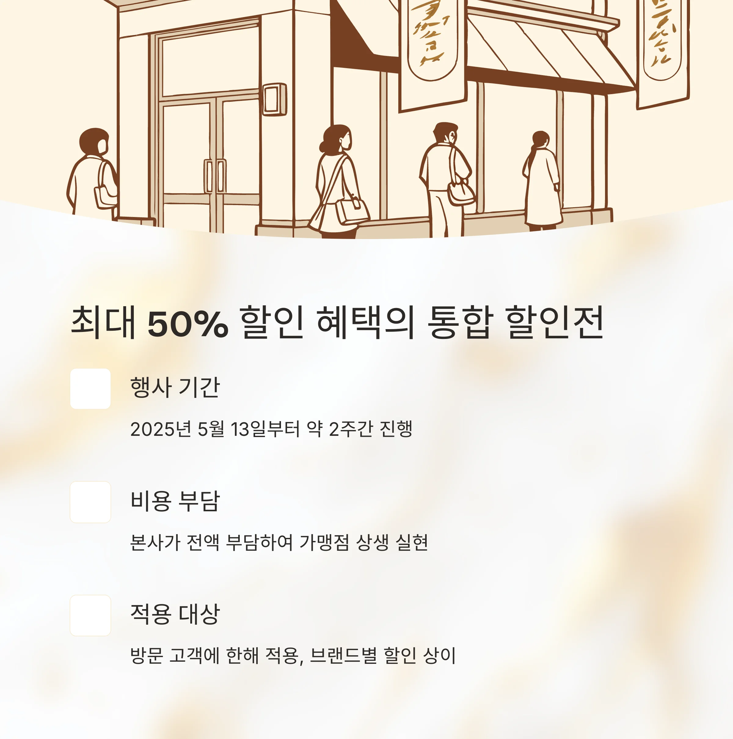 이번 행사는 2025년 5월 13일부터 약 2주간 진행되며, 본사가 비용을 전액 부담해 가맹점 매출 증대와 상생을 실현하는 목적을 갖고 있습니다.
