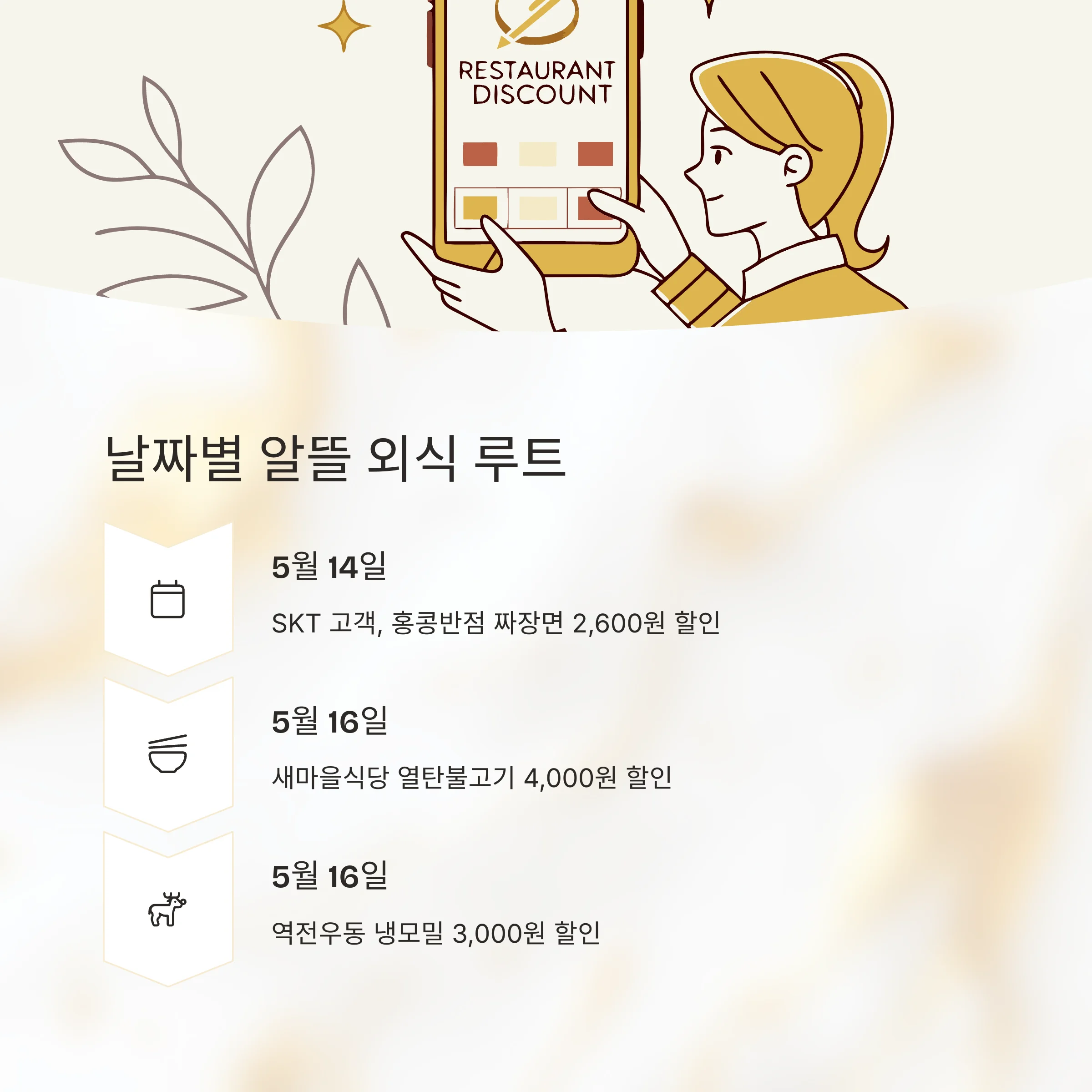 가령 5월 14일에는 SKT 이용 고객이라면 홍콩반점에서 짜장면을 2,600원 할인받을 수 있고,