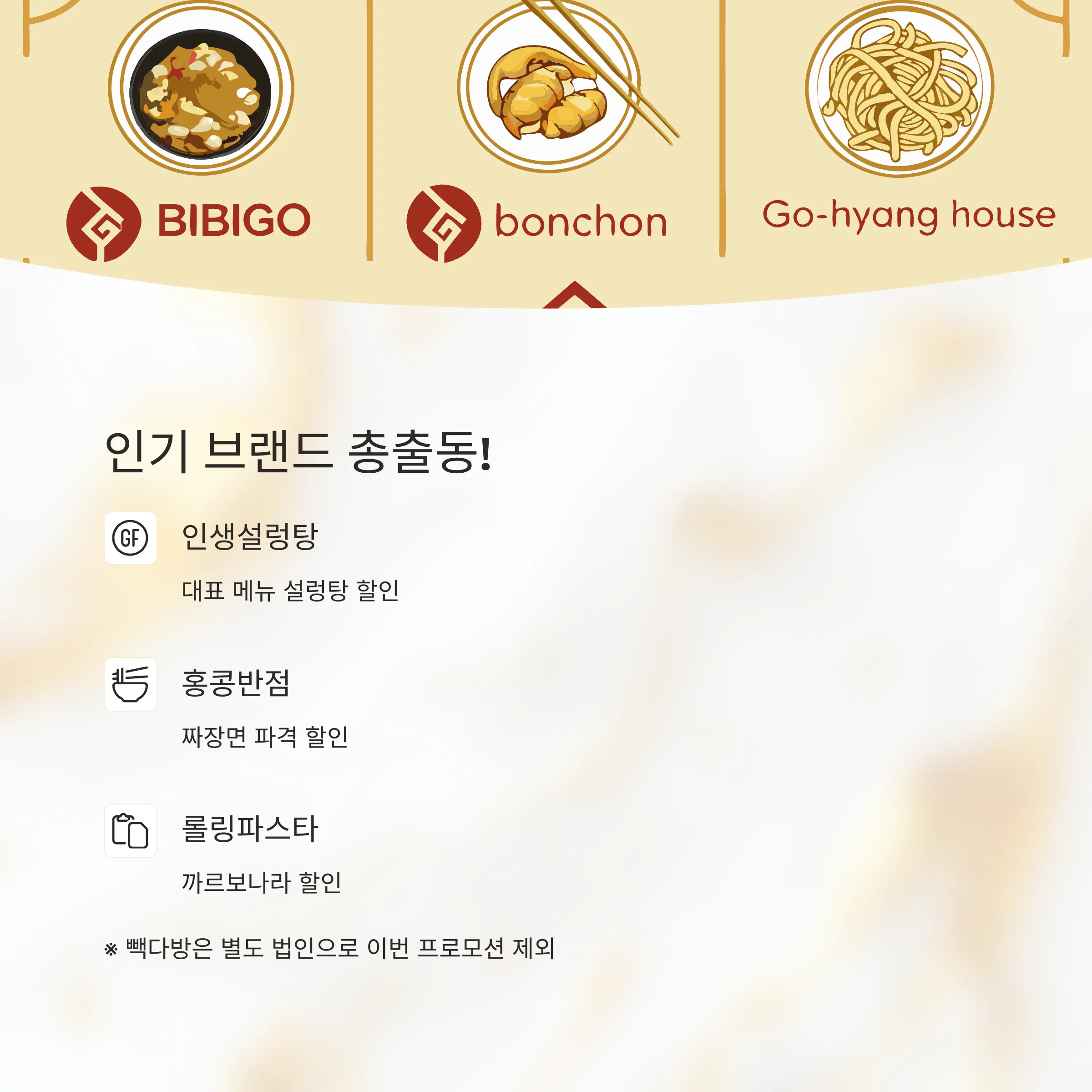 인생설렁탕, 홍콩반점, 롤링파스타, 한신포차 등 소비자 선호도가 높은 브랜드의 대표 메뉴들이 파격 할인됩니다.