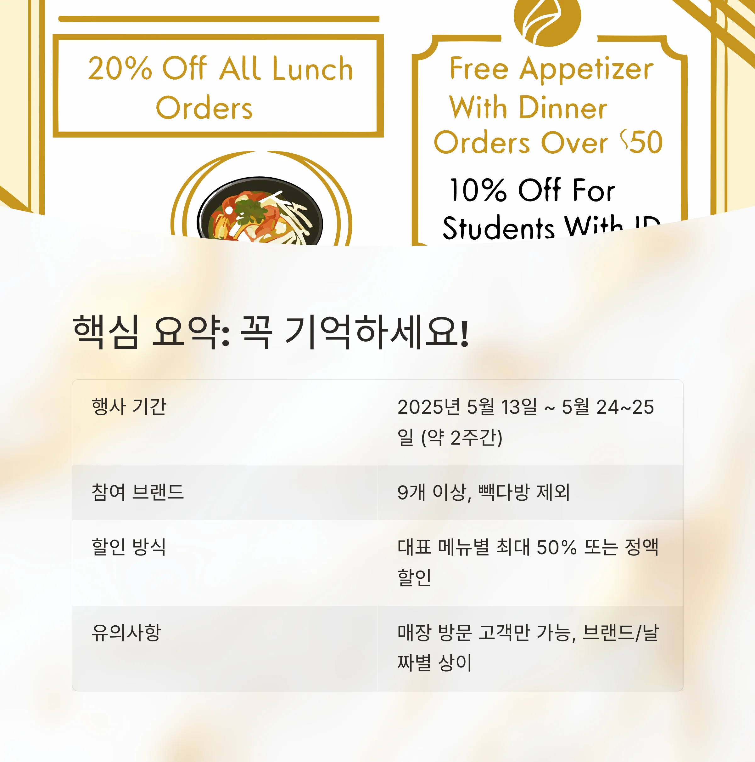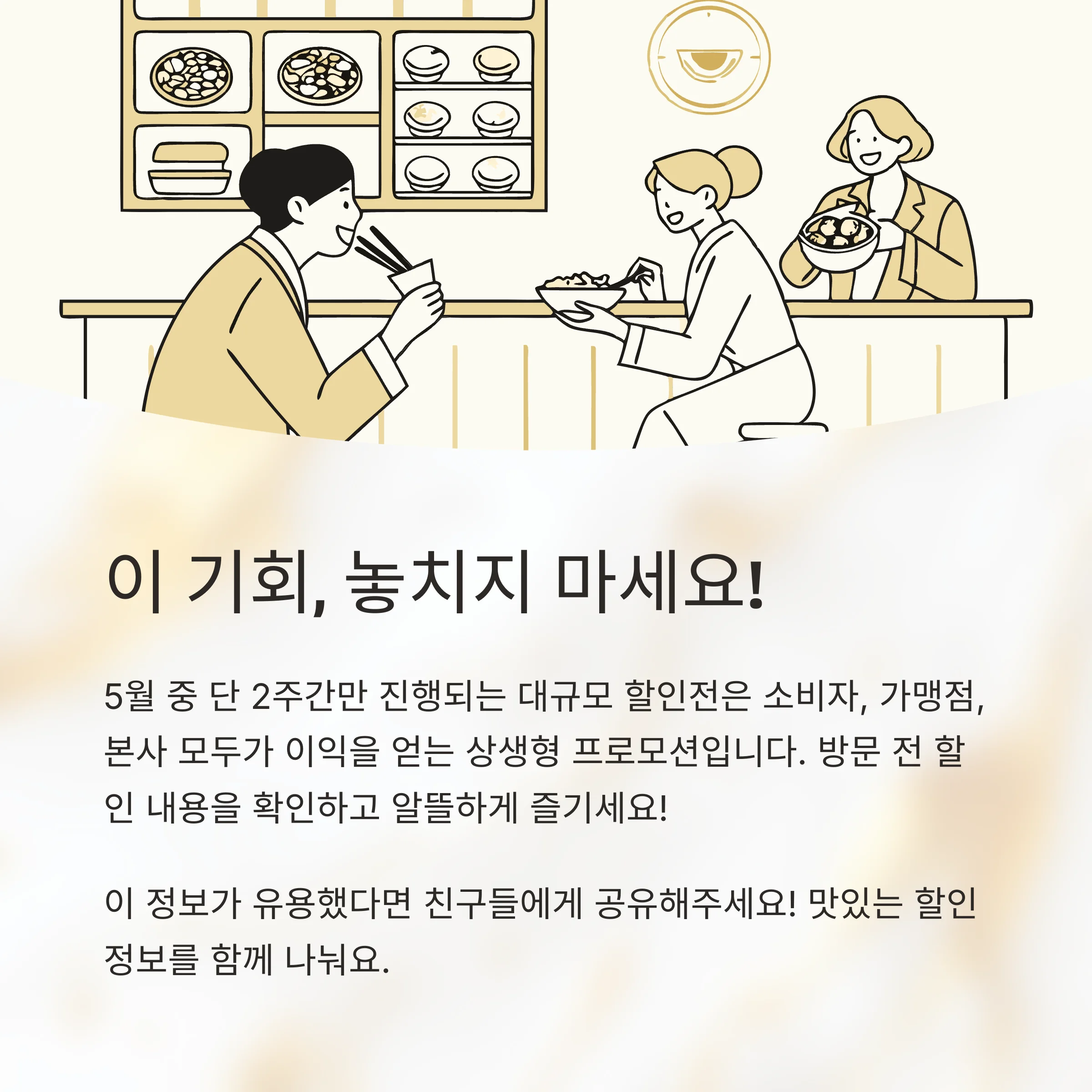 5월 중 단 2주간만 진행되는 대규모 할인전은 단순한 외식 할인 이벤트가 아닙니다.