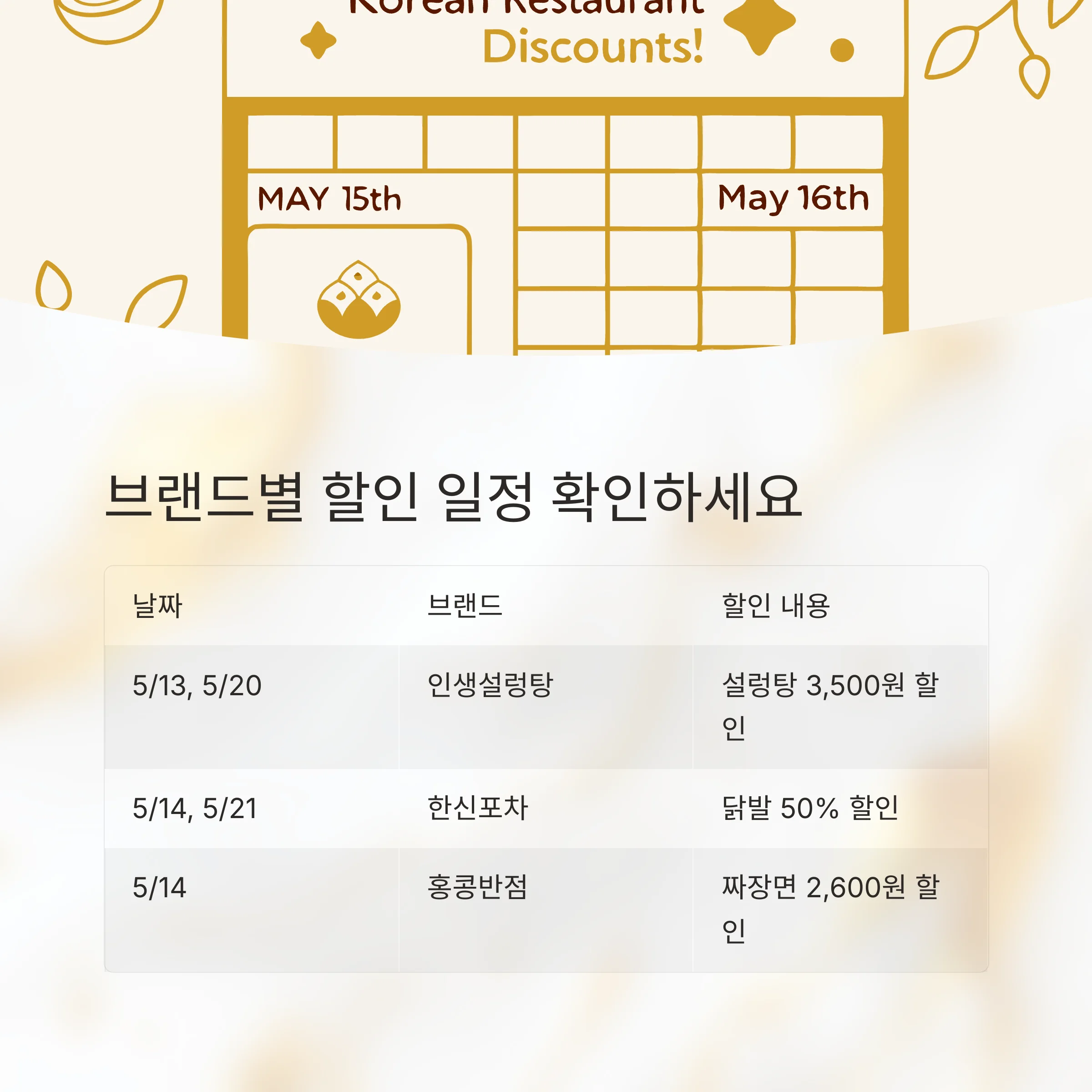 | 5/13, 5/20 | 인생설렁탕 | 설렁탕 3,500원 할인 |
