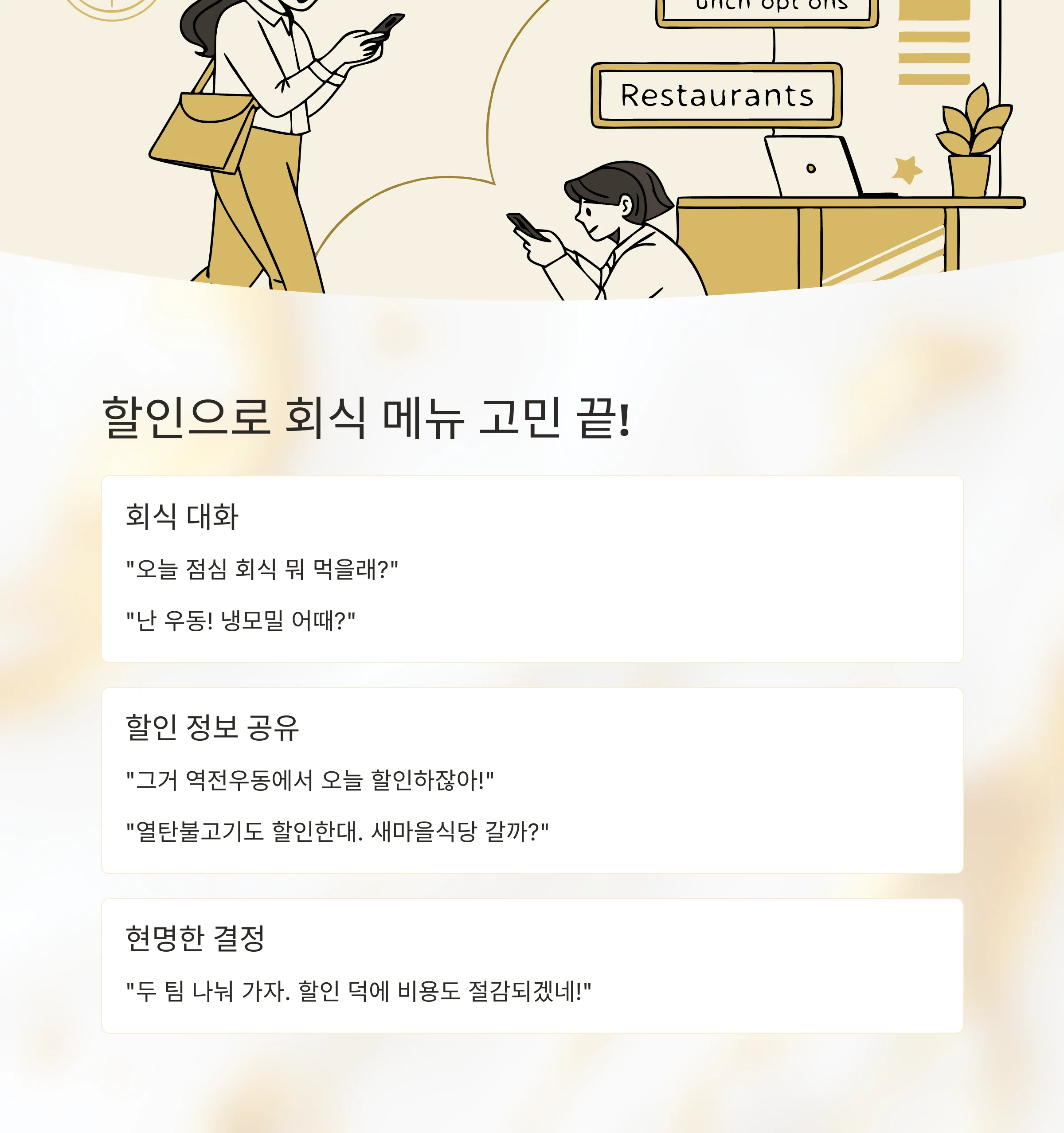 상황극: 점심 회식 메뉴 결정 중, 할인 정보 하나로 갈등 끝