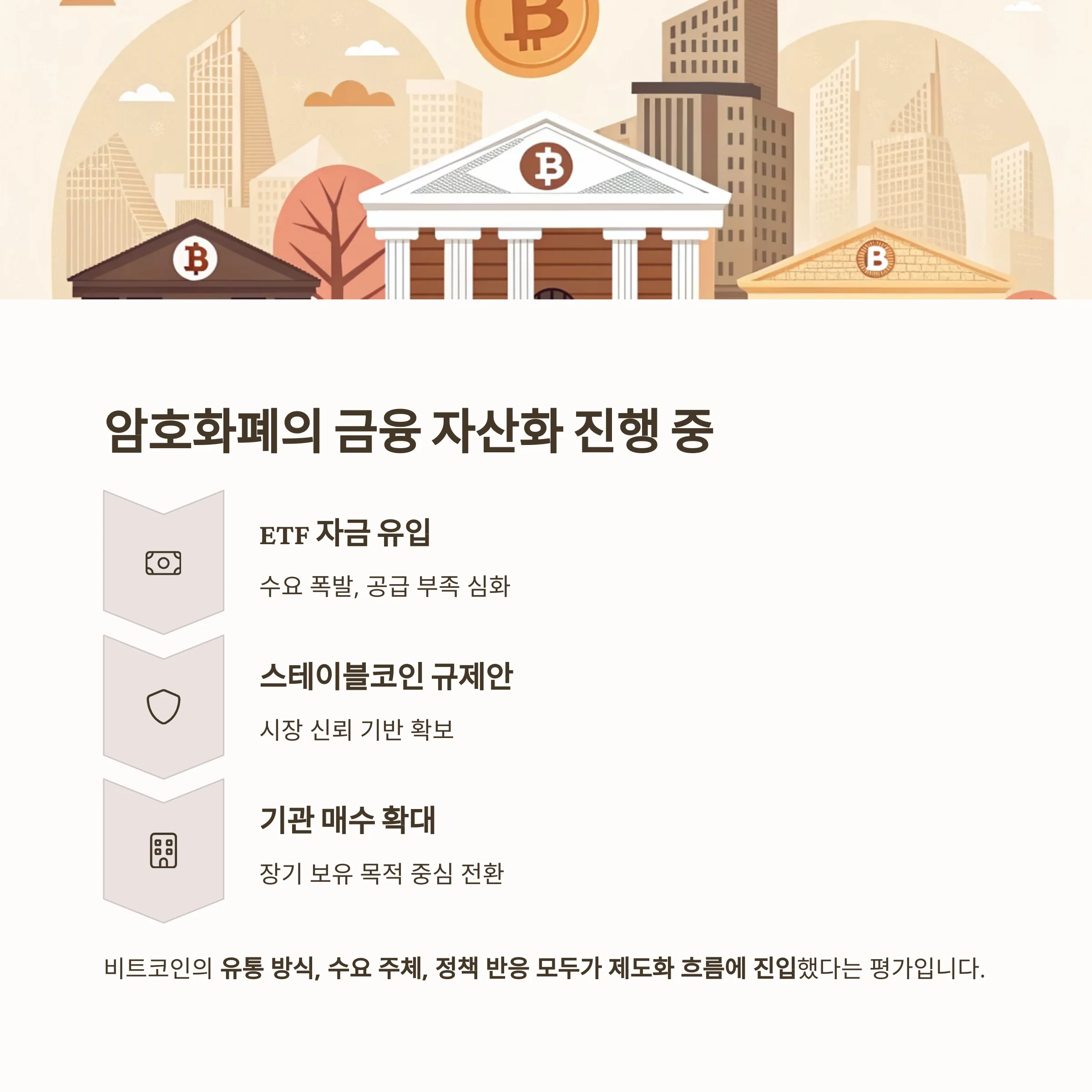 특히 ETF 도입 이후 비트코인의 유통 방식, 수요 주체, 정책 반응 모두가 제도화 흐름에 진입했다는 평가가 지배적입니다.