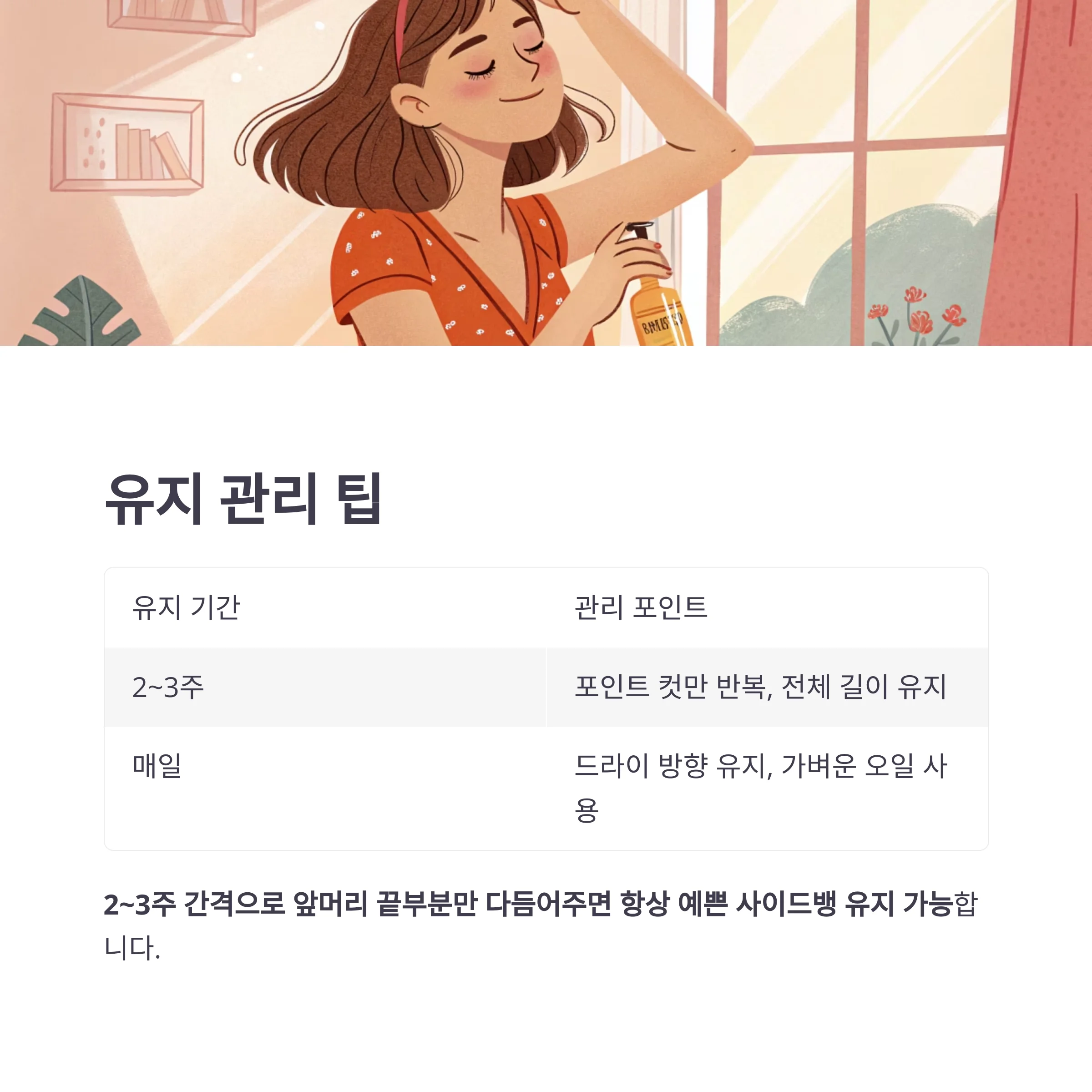 2~3주 간격으로 앞머리 끝부분만 다듬어주면 항상 예쁜 사이드뱅 유지 가능합니다.