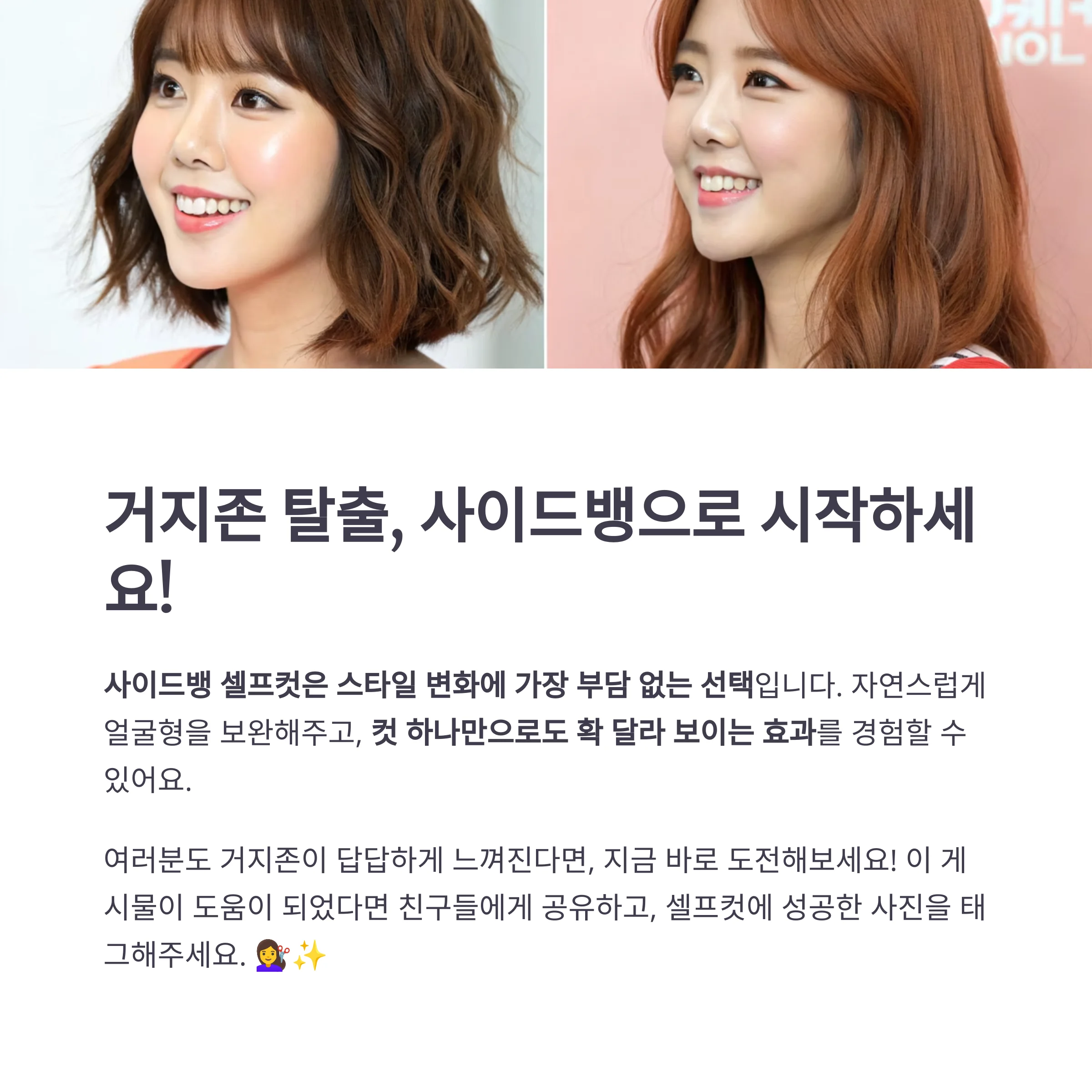 스타일은 안 나오고, 자르자니 아깝고… 이럴 땐 사이드뱅 셀프컷으로 분위기 전환을 시도해보세요.