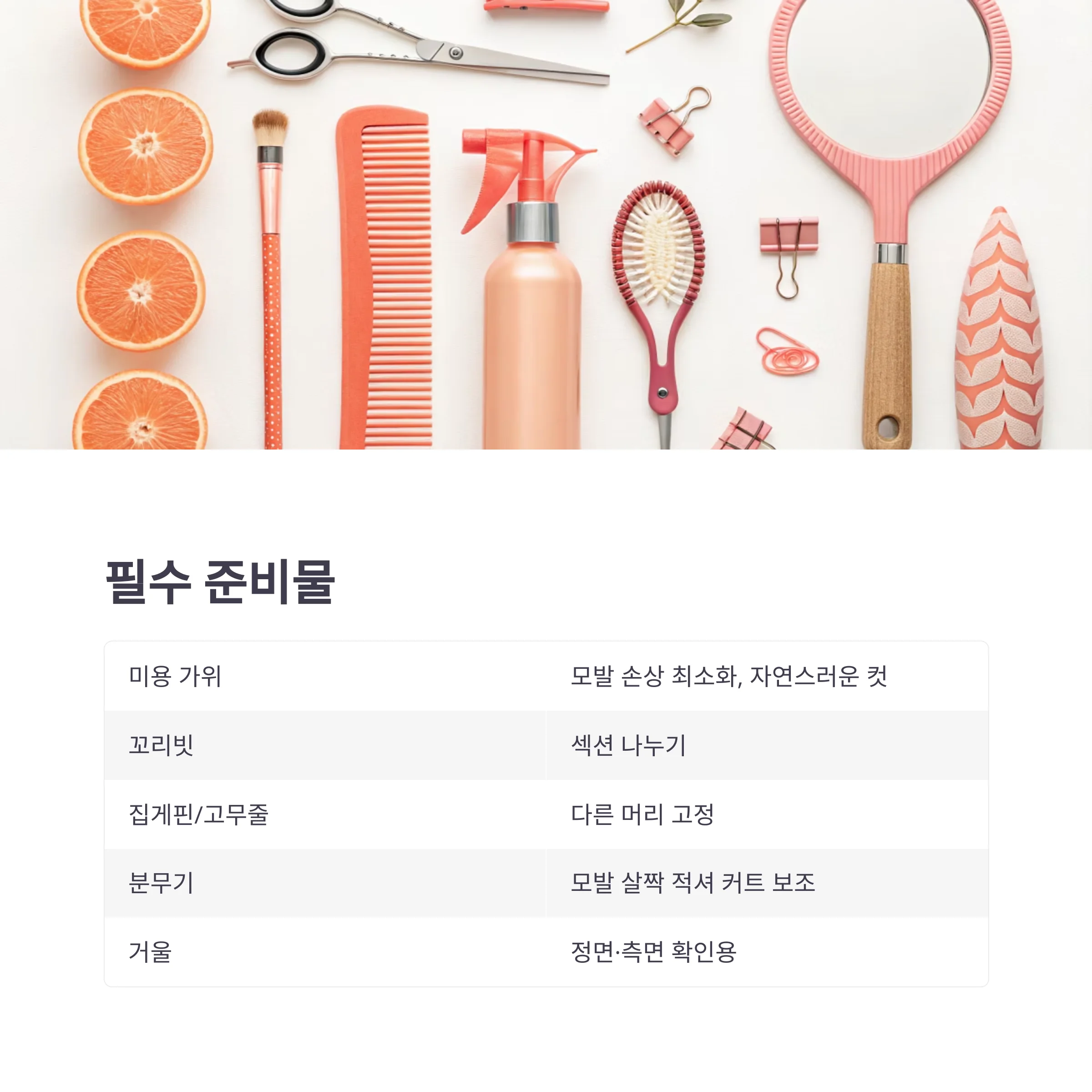 꼬리빗과 고무줄, 분무기, 정면/측면 거울까지 함께 준비하면 정확한 각도와 길이 조절이 쉬워집니다.