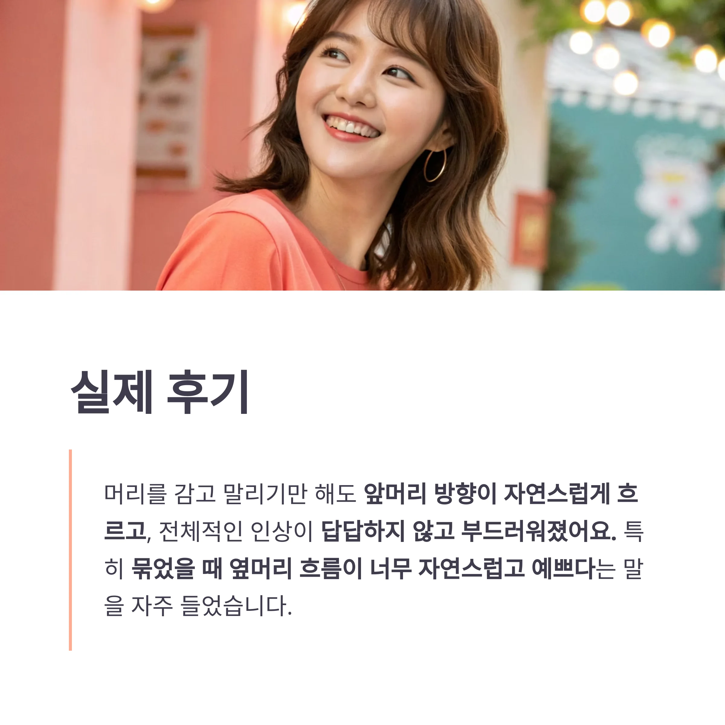 특히 묶었을 때 옆머리 흐름이 너무 자연스럽고 예쁘다는 말을 자주 들었습니다.”