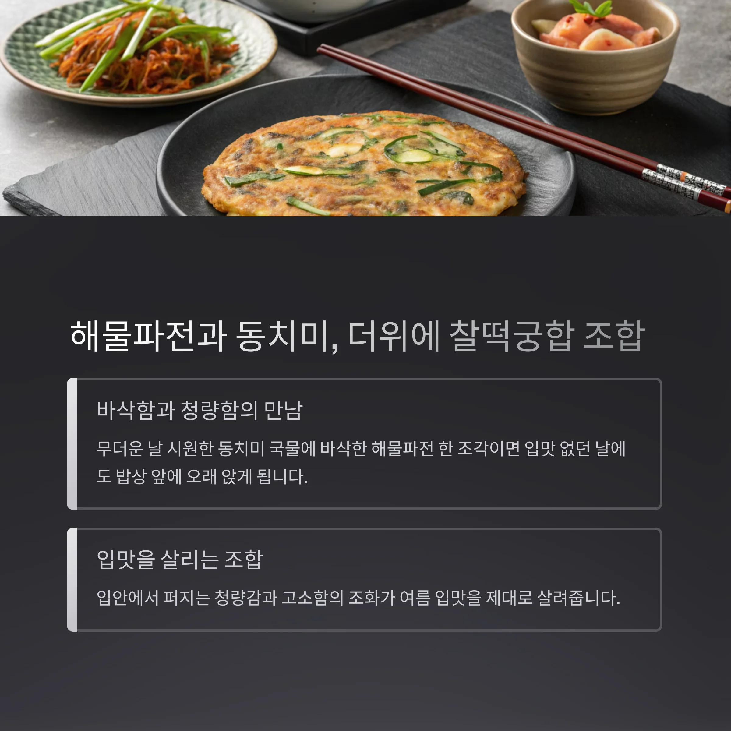 무더운 날 시원한 동치미 국물에 바삭한 해물파전 한 조각이면