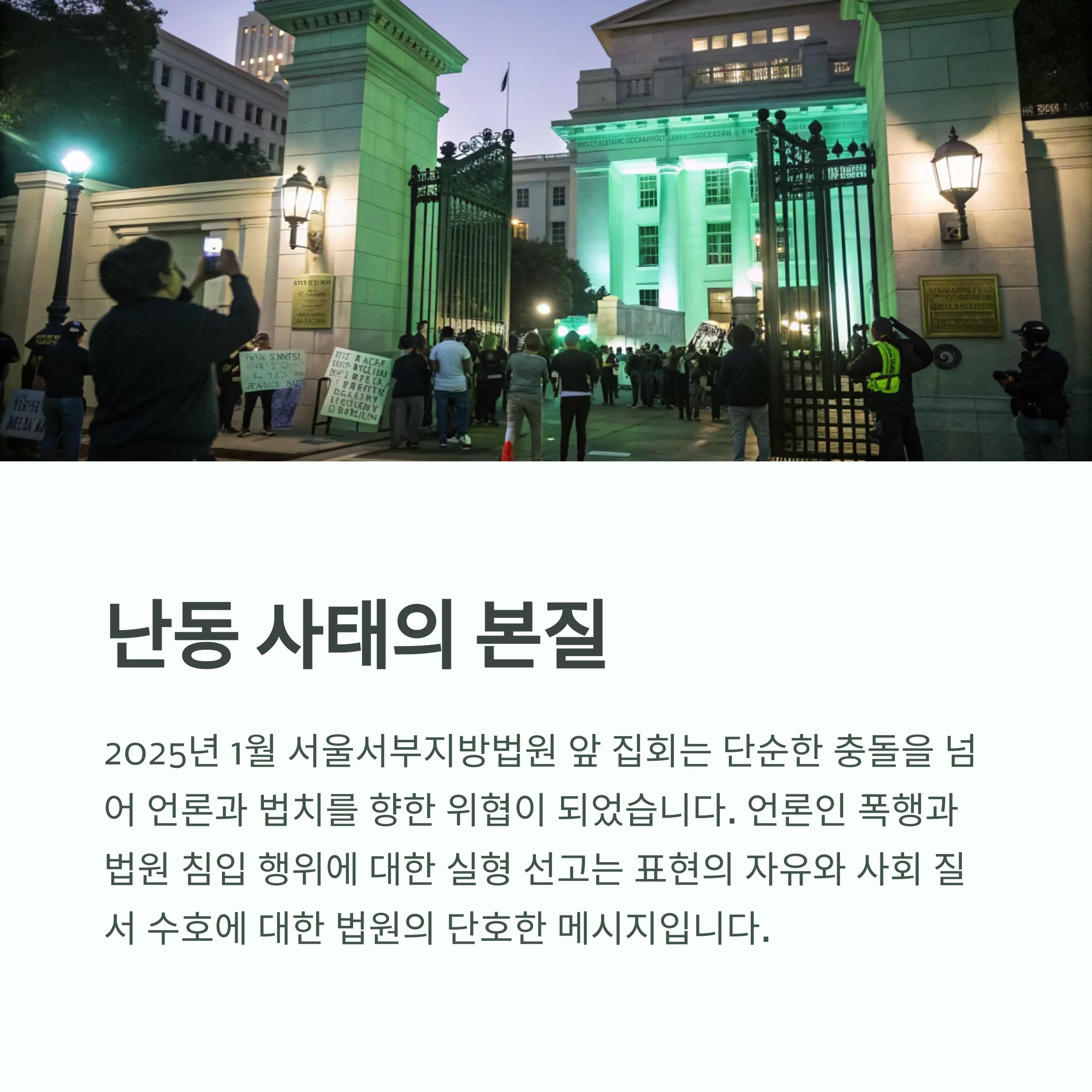 2025년 1월 서울서부지방법원 앞에서 벌어진 집회 및 난동 사태는 단순한 물리적 충돌을 넘어, 언론과 법치를 향한 위협으로 번졌습니다. 언론인을 폭행하고 법원 담장을 넘은 시민들에게 실형이 선고된 이번 판결은, 표현의 자유와 사회 질서를 어떻게 지켜야 하는지에 대한 법원의 단호한 메시지를 담고 있습니다.