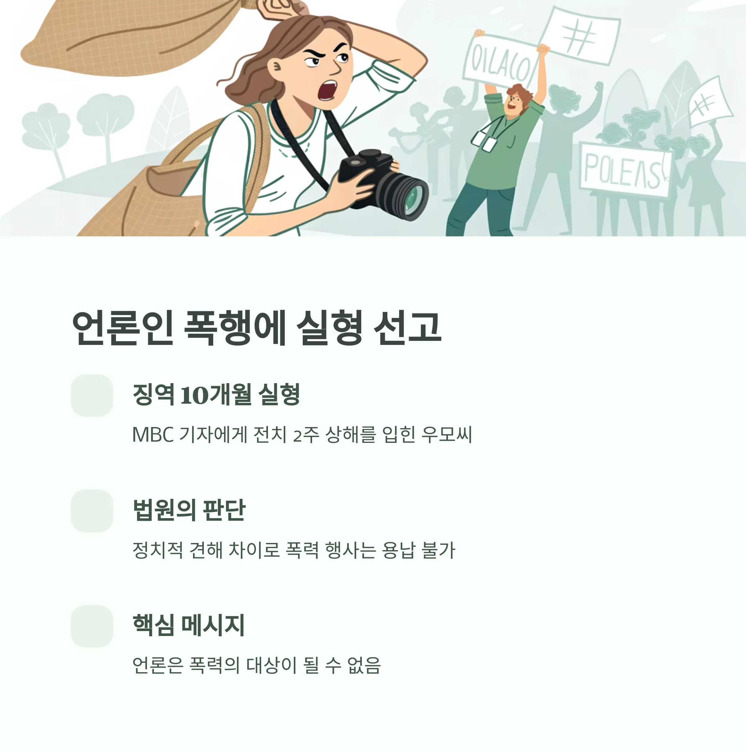 재판부는 "정치적 견해 차이를 이유로 폭력을 휘두른 행위는 결코 용납할 수 없다"고 명확히 밝혔습니다.