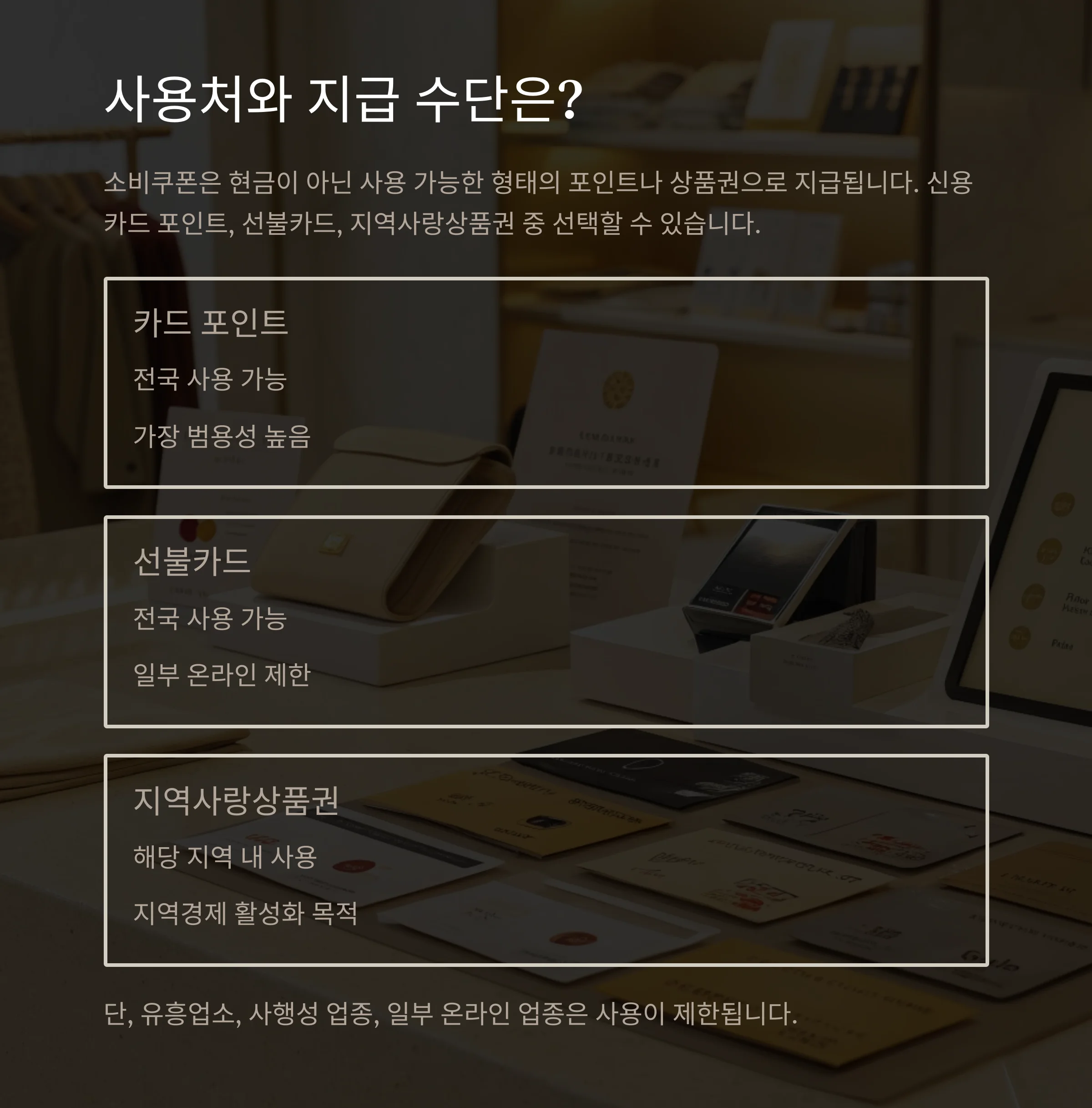 단, 유흥업소, 사행성 업종, 일부 온라인 업종은 사용이 제한됩니다.