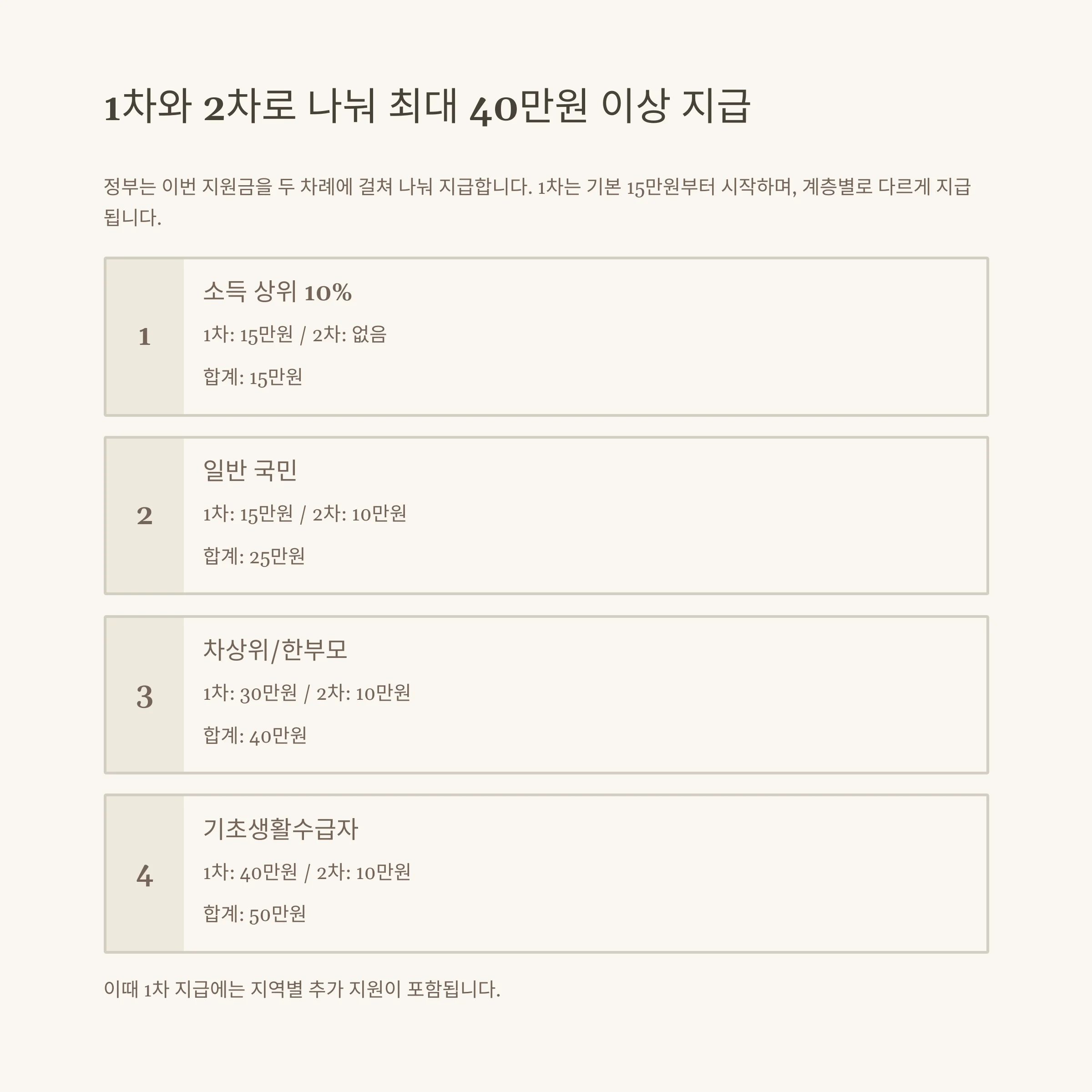 | 지역 구분 | 추가 지급 | 최종 1차 금액 예시(일반국민) |