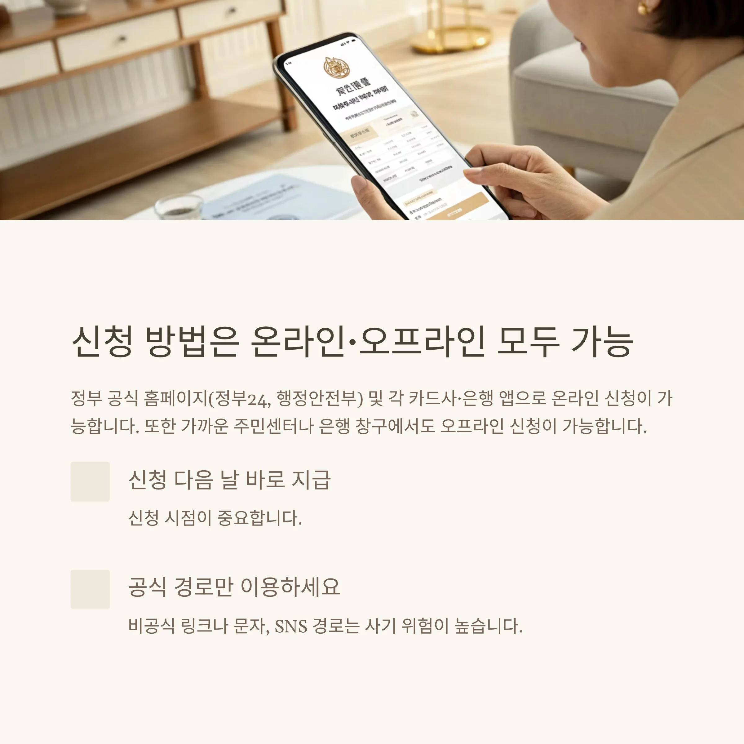 또한 가까운 주민센터나 은행 창구에서도 오프라인 신청이 가능합니다.