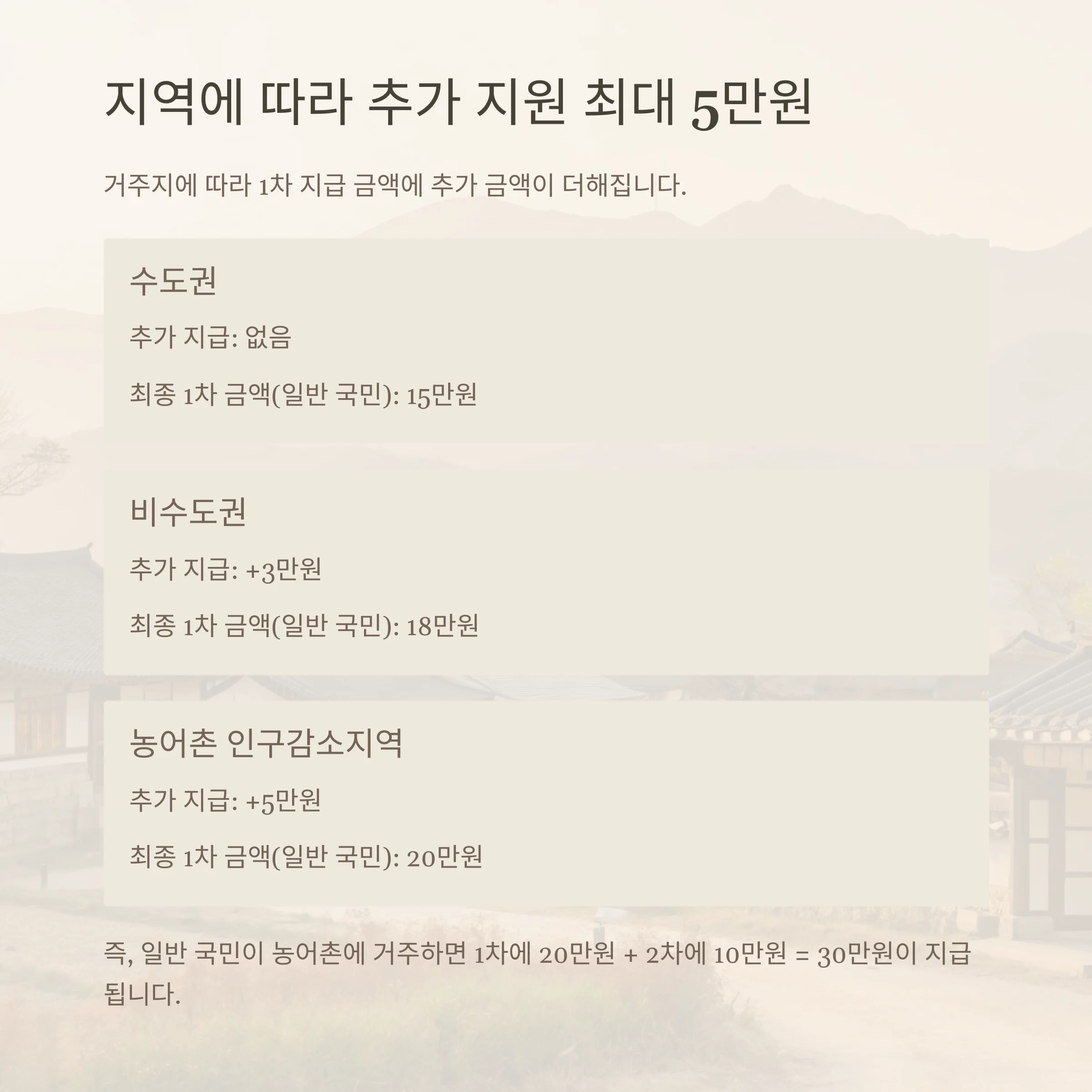 즉, 일반 국민이 농어촌에 거주하면 1차에 20만원 + 2차에 10만원 = 30만원이 지급됩니다.