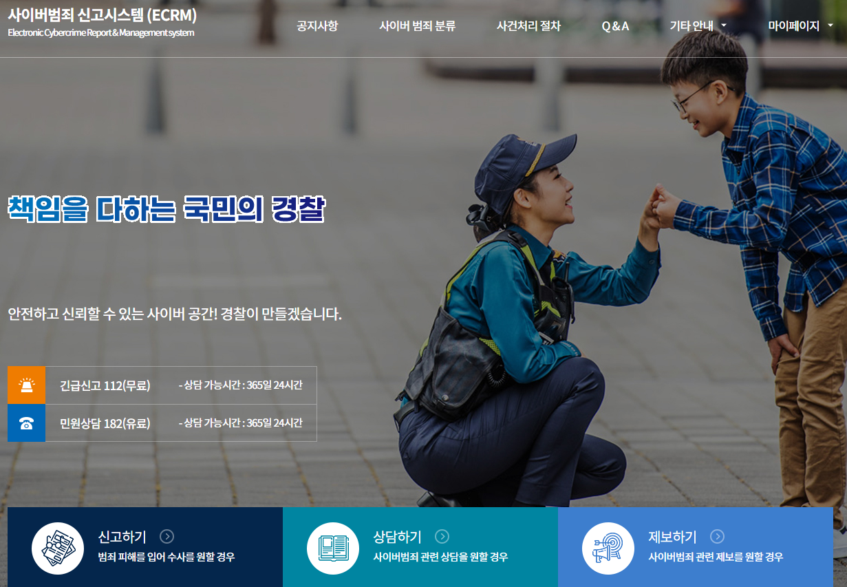 - 경찰청 사이버범죄 신고(https://ecrm.police.go.kr) 또는 112 신고