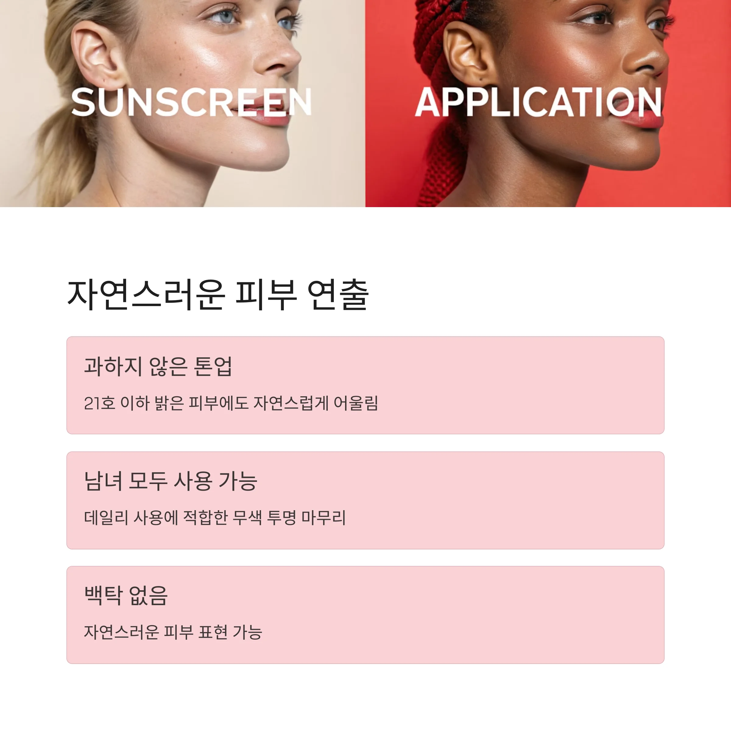 톤업 효과가 과하지 않아 21호 이하 밝은 피부에도 부자연스러움 없이 자연스럽게 사용 가능합니다.