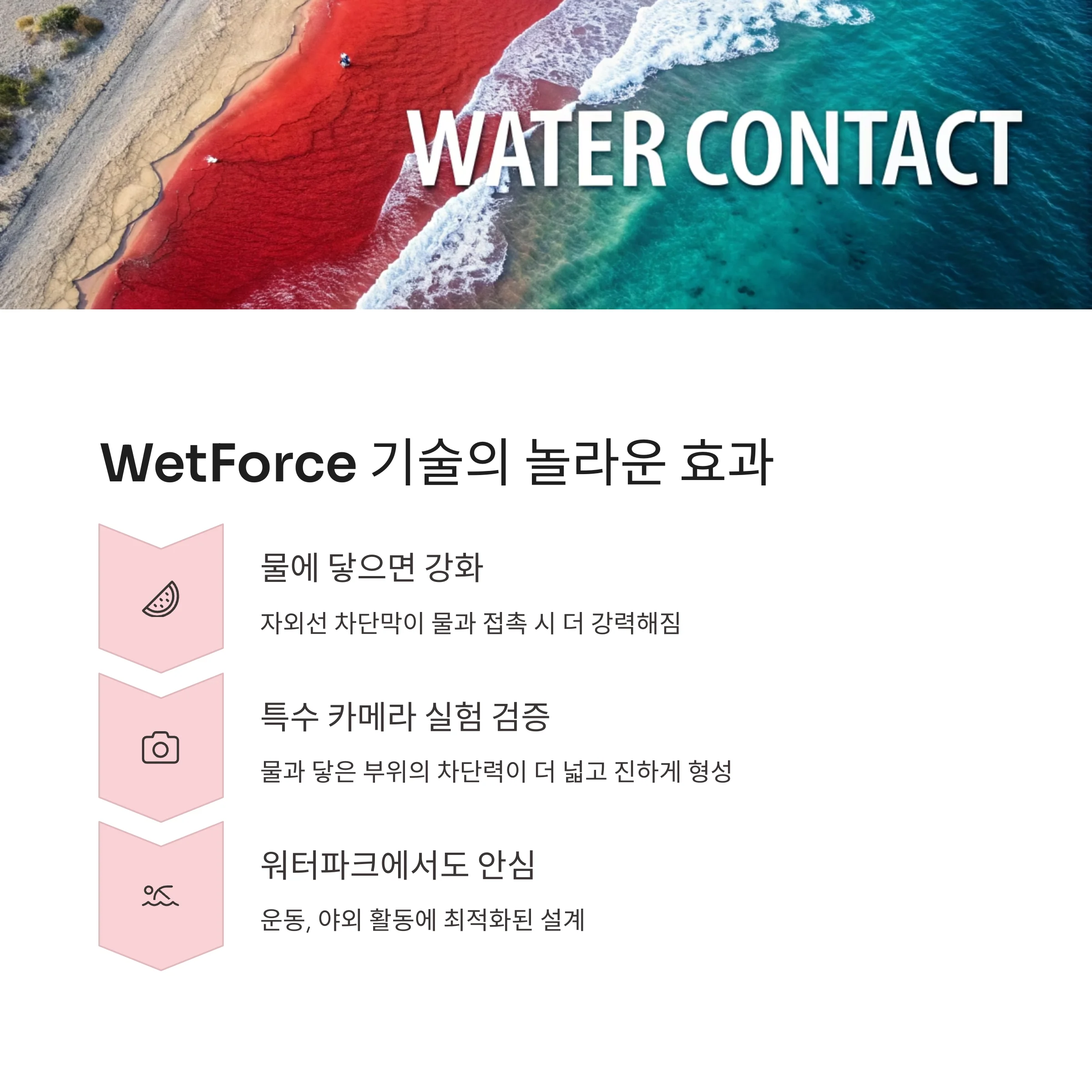 | WetForce 기술 | 물·땀에 닿을수록 차단막 강화 |