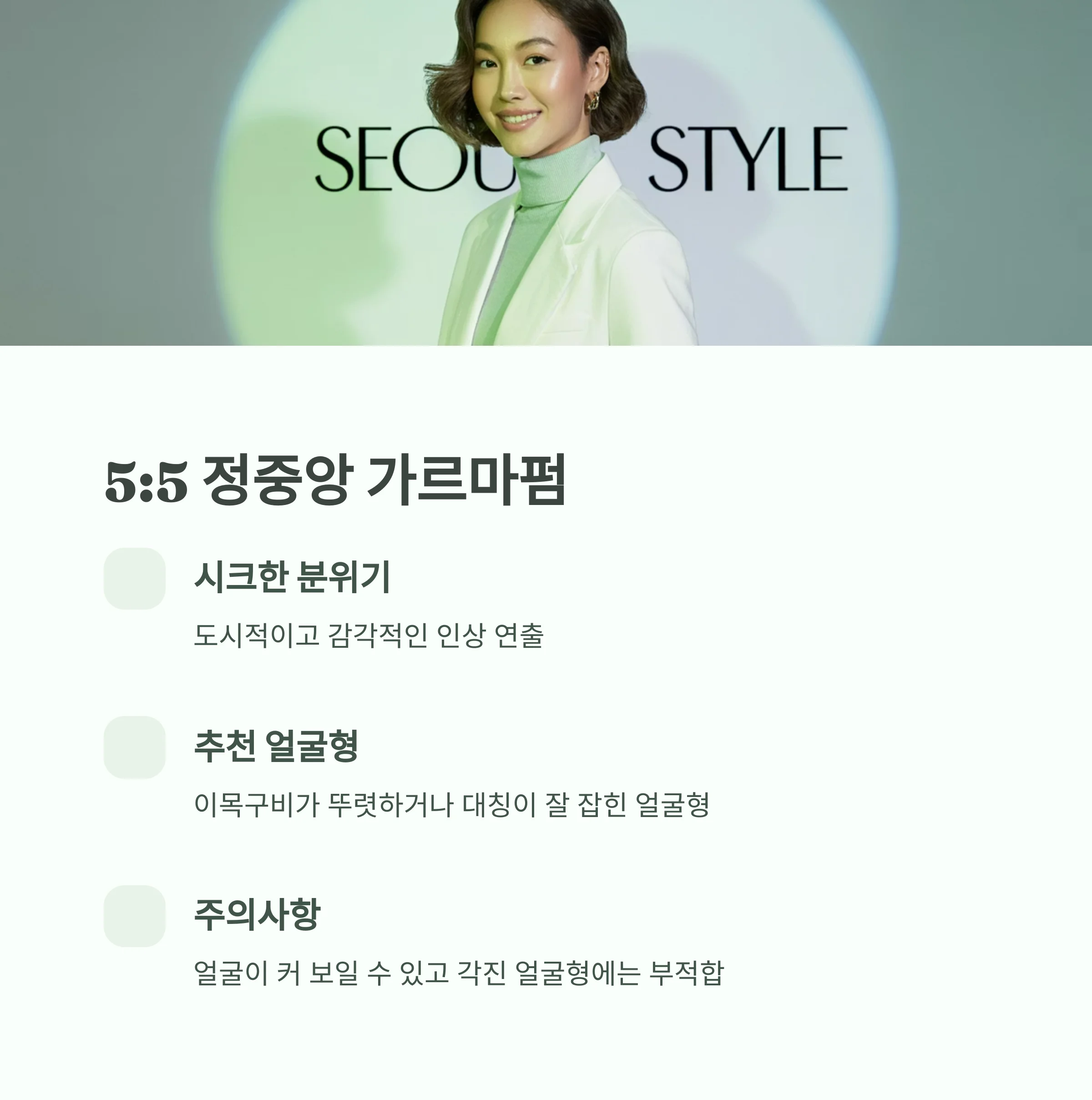 | 5:5 | 시크, 도회적 | 계란형, 갸름한 얼굴형 |