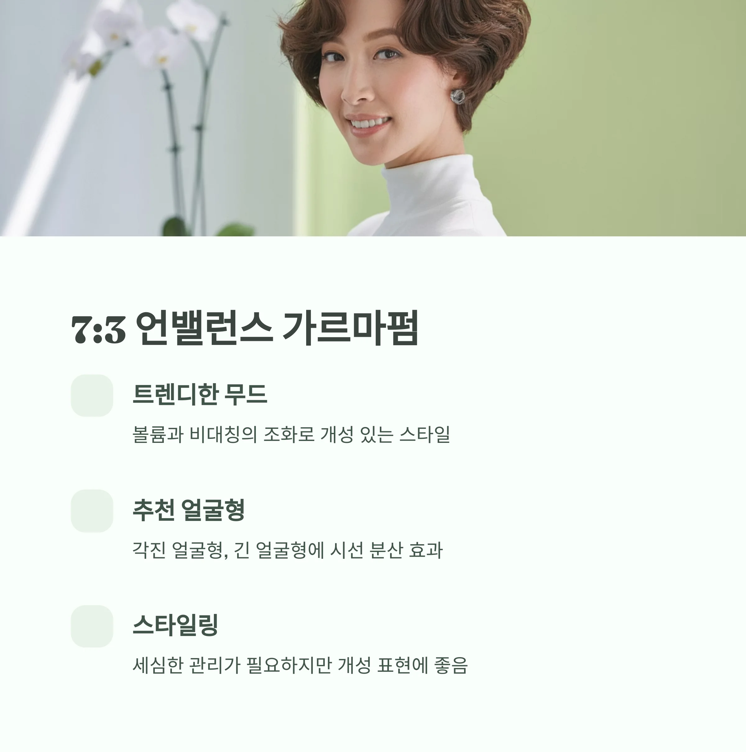 | 7:3 | 트렌디하고 개성 | 긴 얼굴형, 각진 얼굴형 |