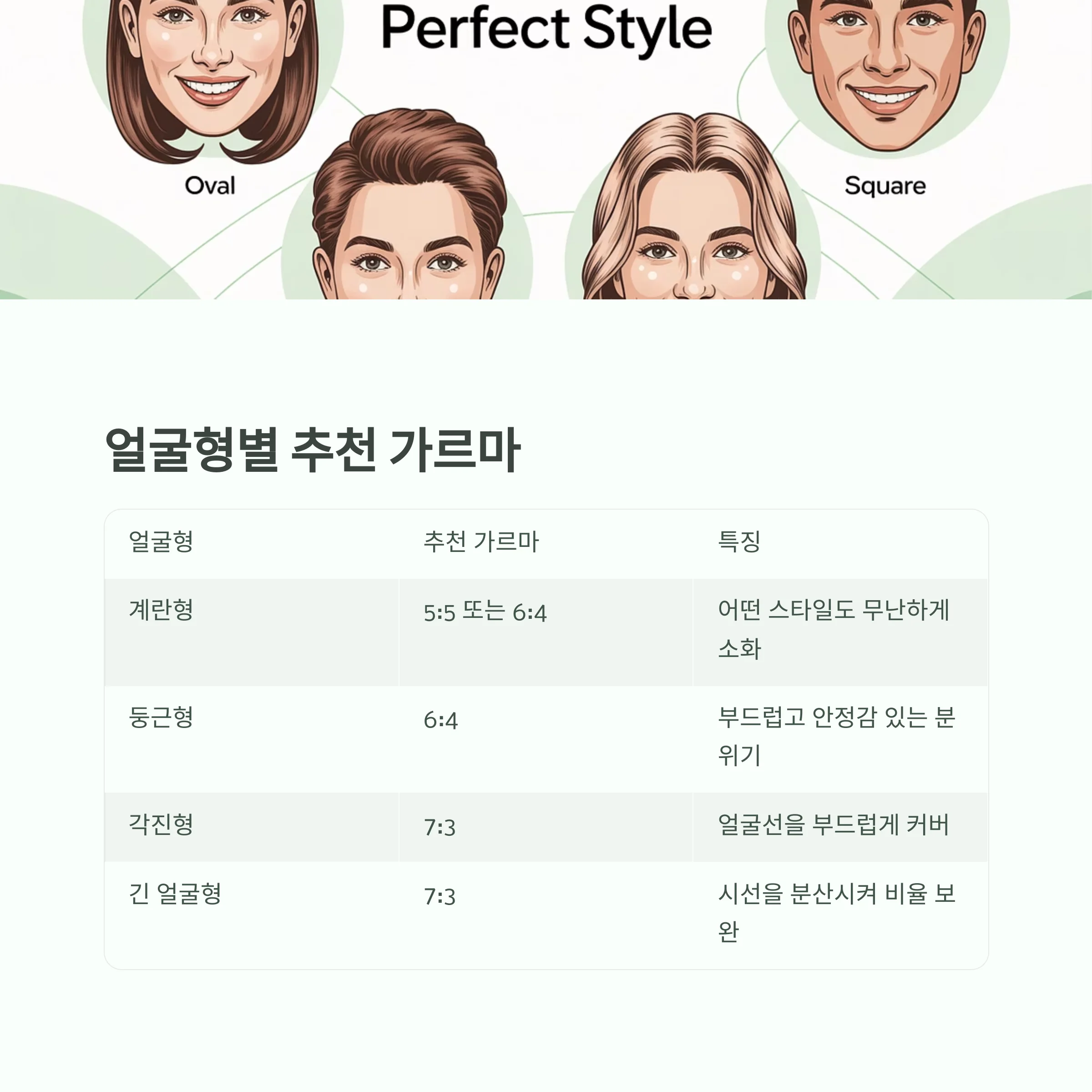 | 계란형 | 5:5 또는 6:4 | 어떤 스타일도 무난하게 소화 |