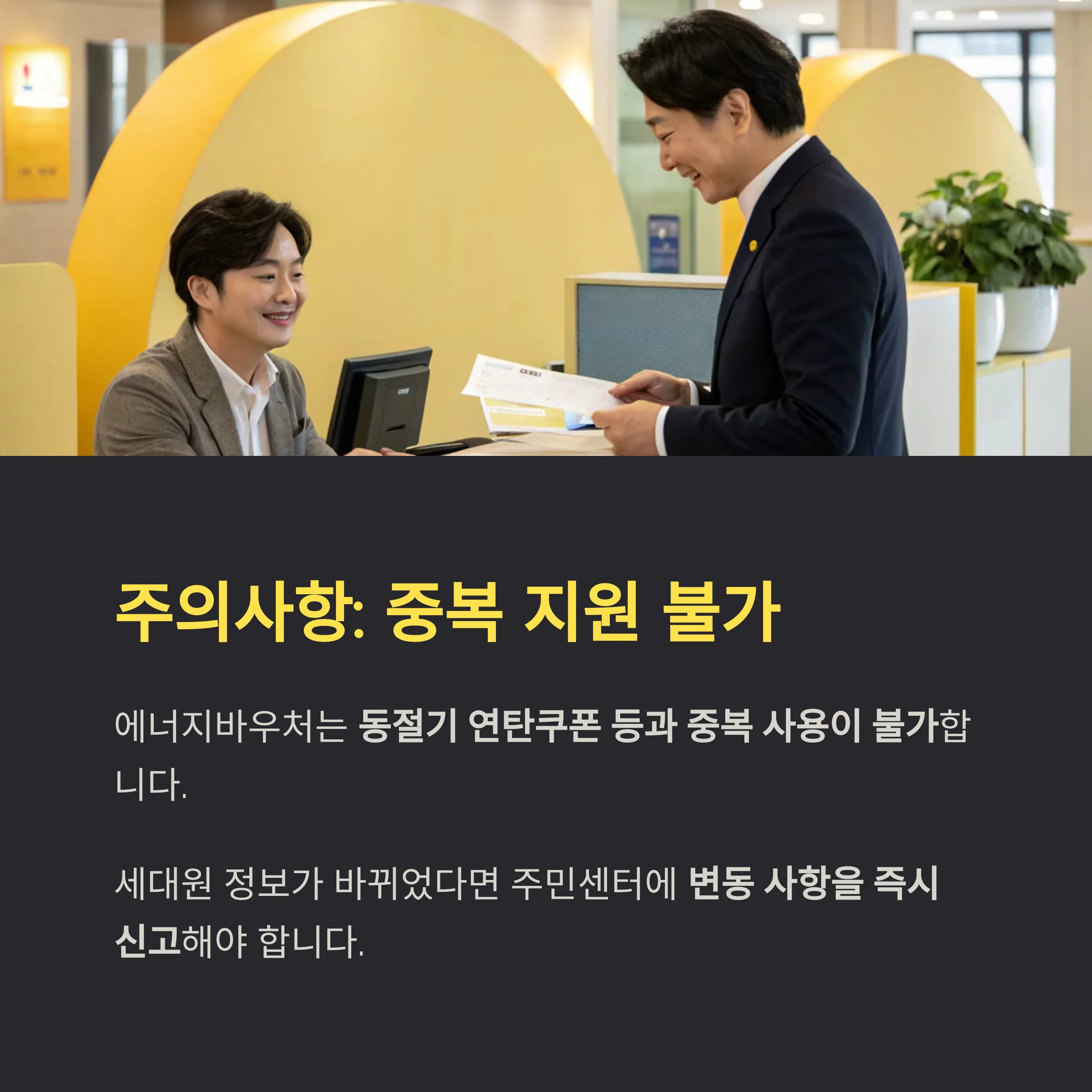 에너지바우처는 동절기 연탄쿠폰 등과 중복 사용이 불가합니다.
