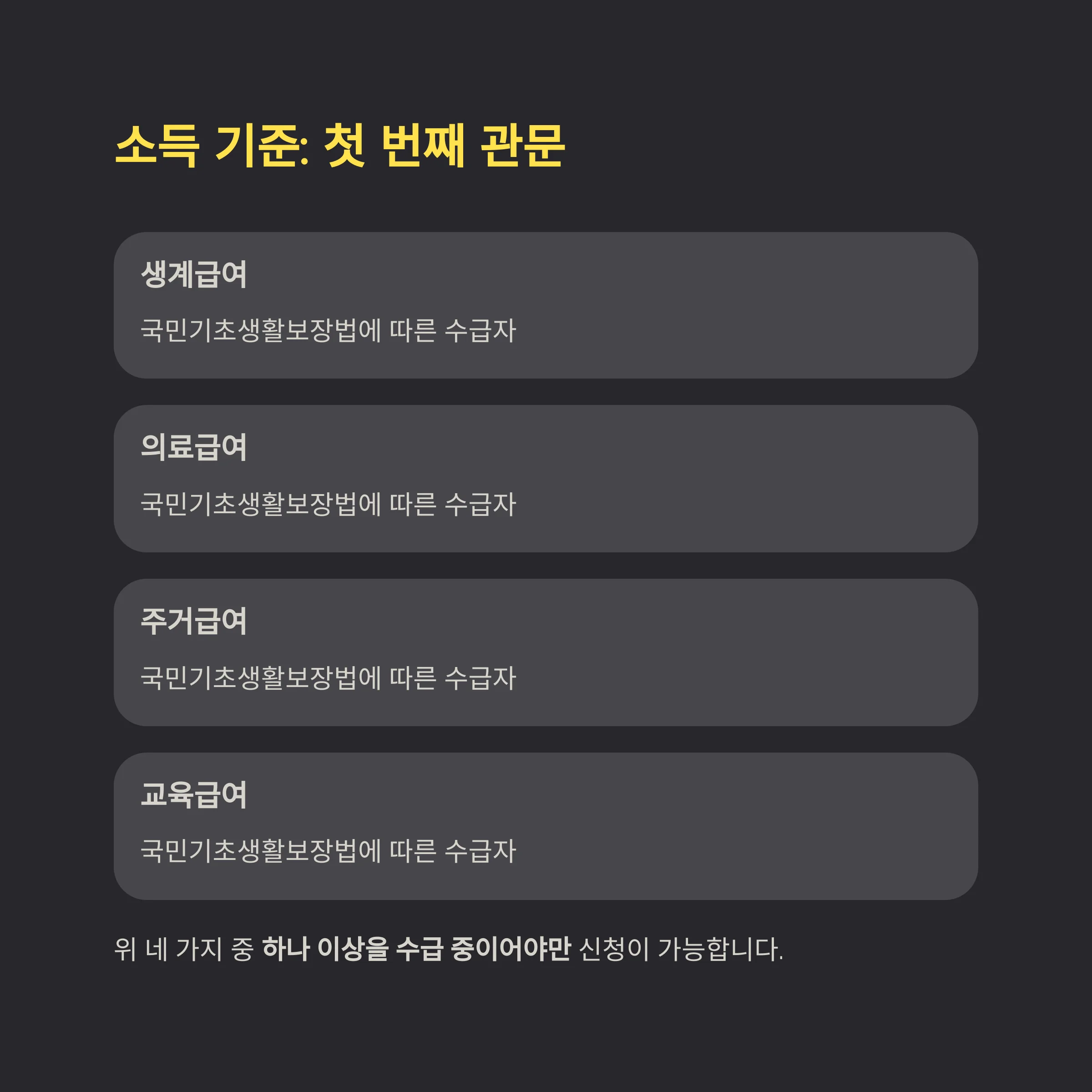 | 수급자 자격 | 4대 급여 중 하나 이상 수급 여부 확인 |