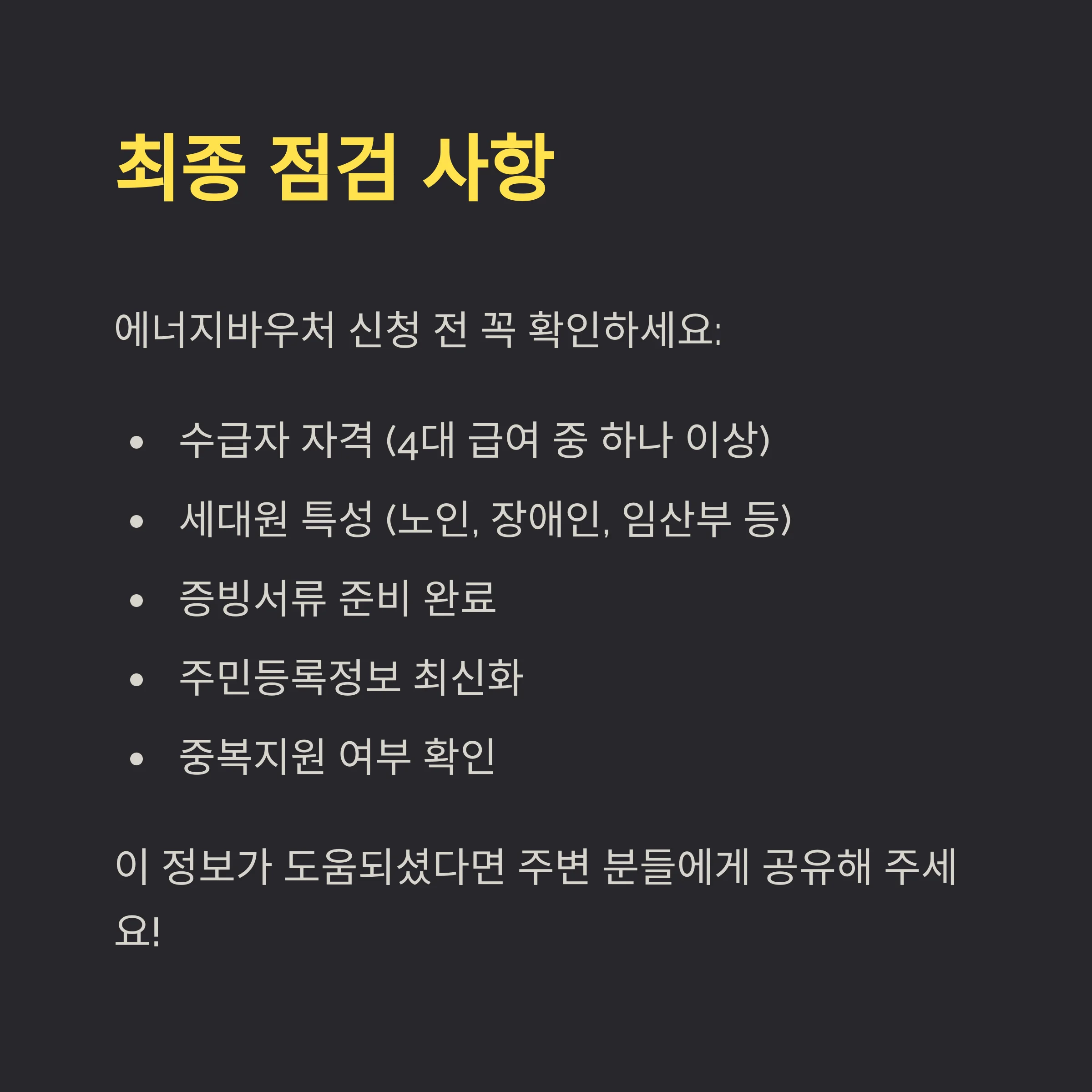 이 다섯 가지를 충실히 준비하면, 에너지바우처 신청 심사에서 떨어질 이유는 없습니다.