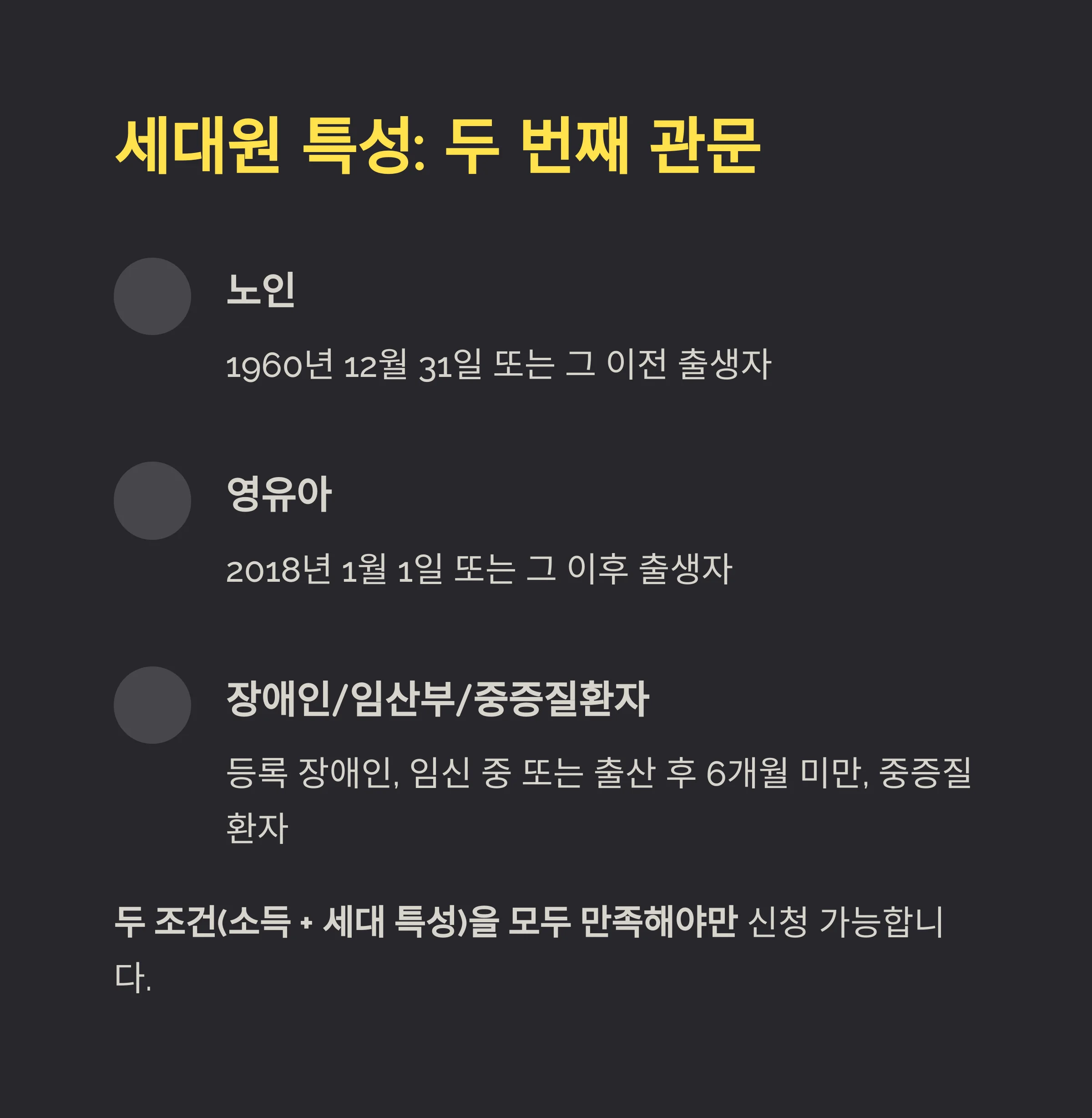 두 조건(소득 + 세대 특성)을 모두 만족해야만 신청 가능합니다.