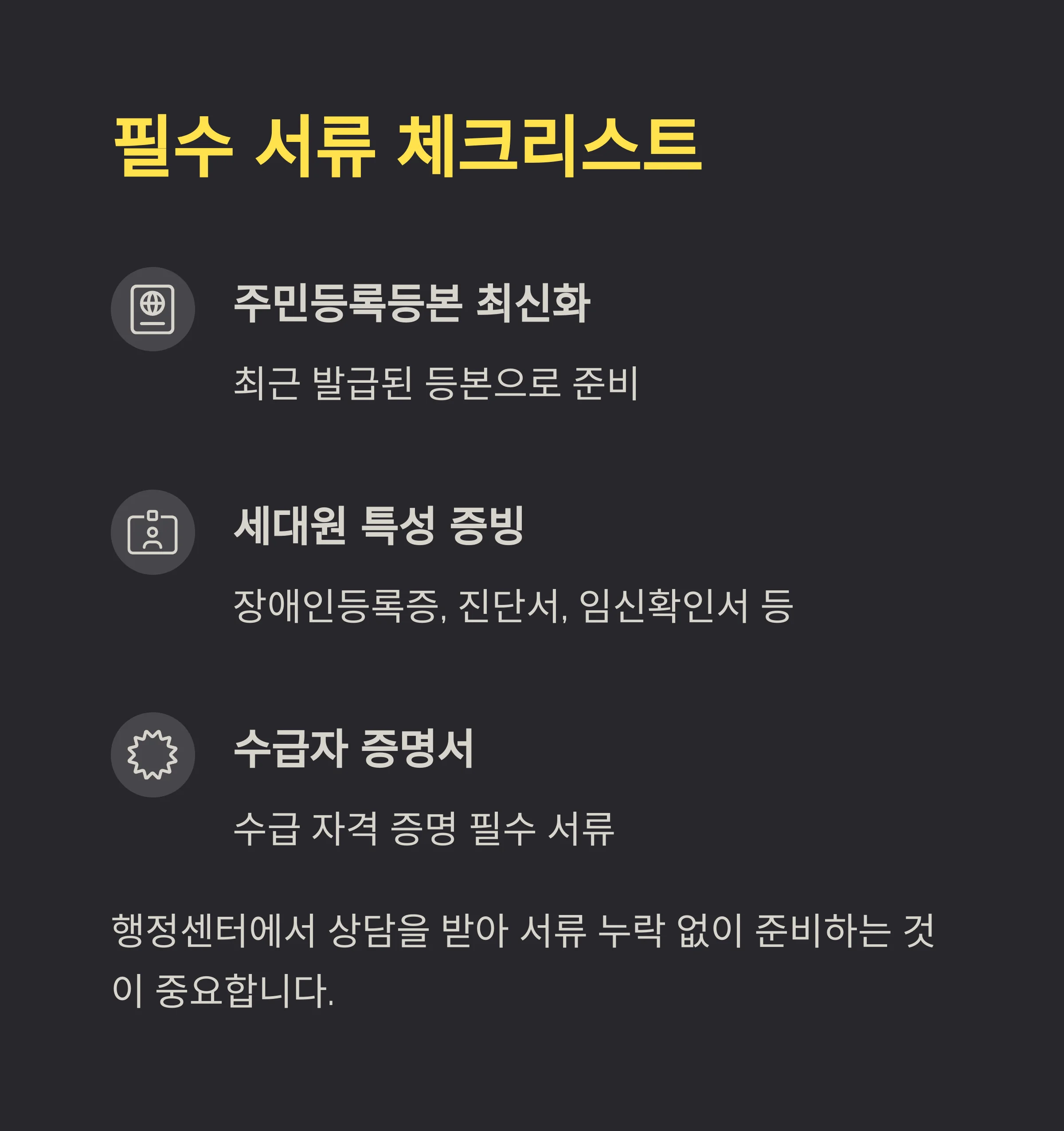 - 세대원 특성 관련 증빙: 장애인등록증, 진단서, 임신확인서 등