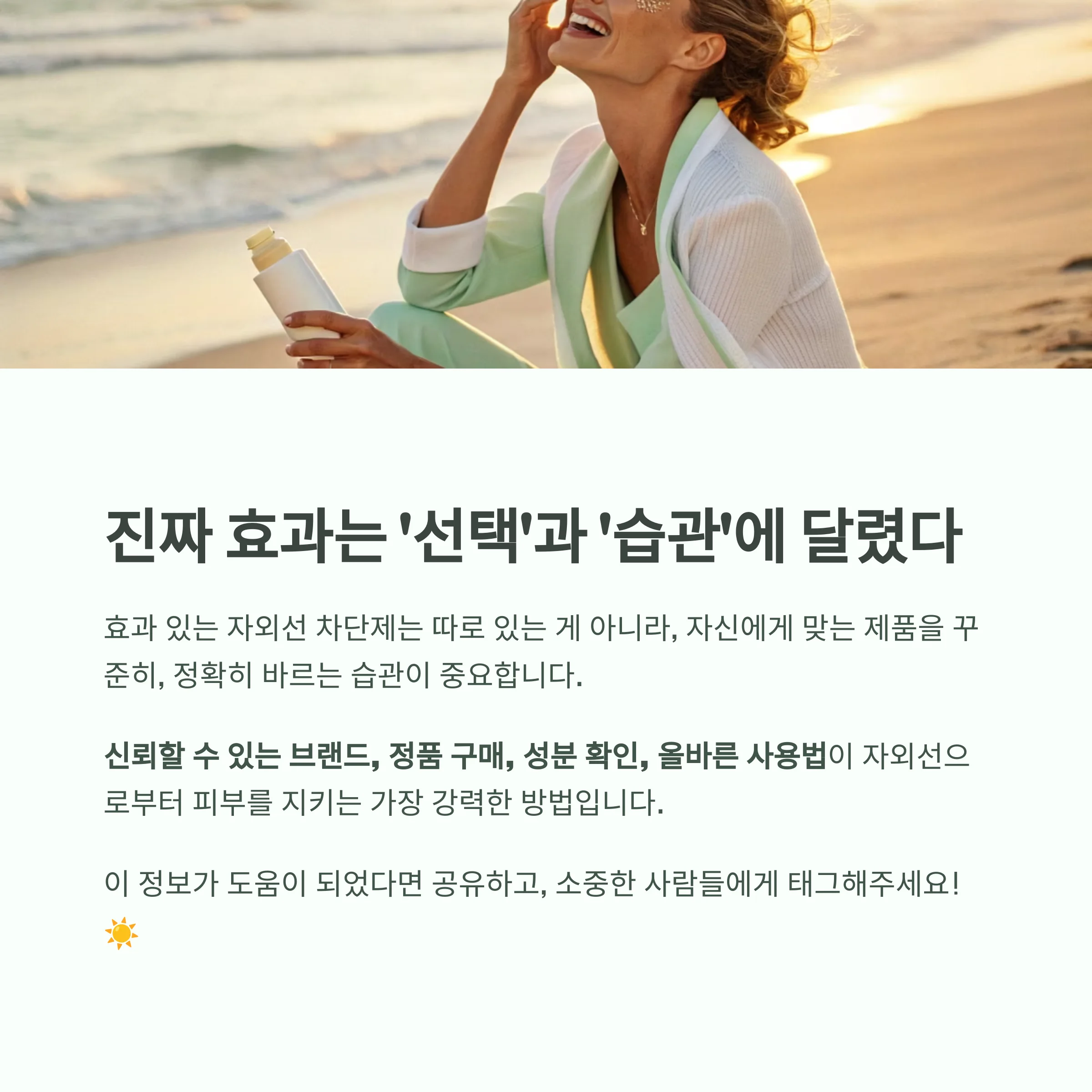 "진짜 효과 있는 자외선 차단제는 따로 있다기보다는, 조건에 맞는 제품을 제대로 고르는 것이 핵심"입니다.