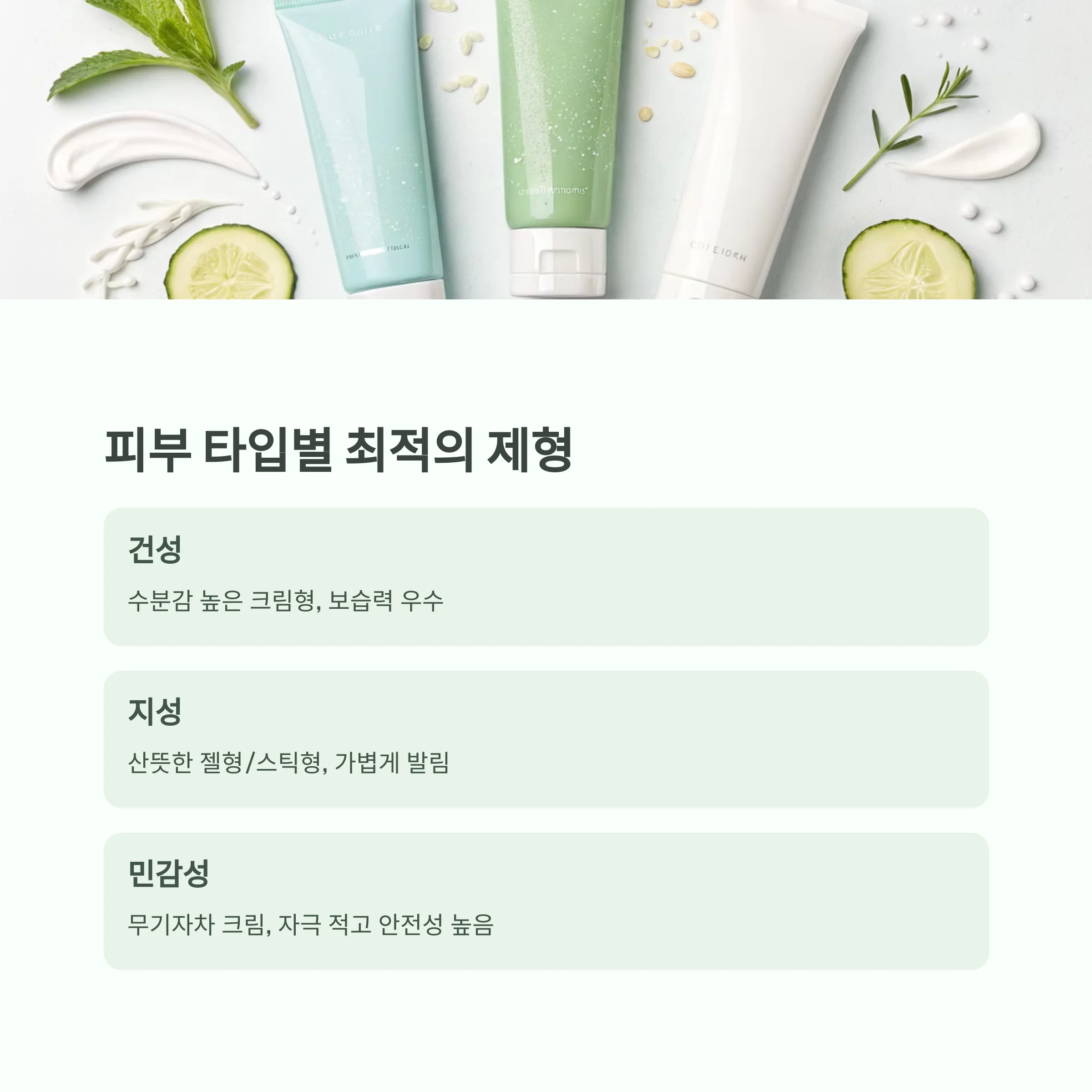 "피부가 건조하다면 수분감 높은 크림을, 지성이면 산뜻한 젤 타입을 추천"합니다.