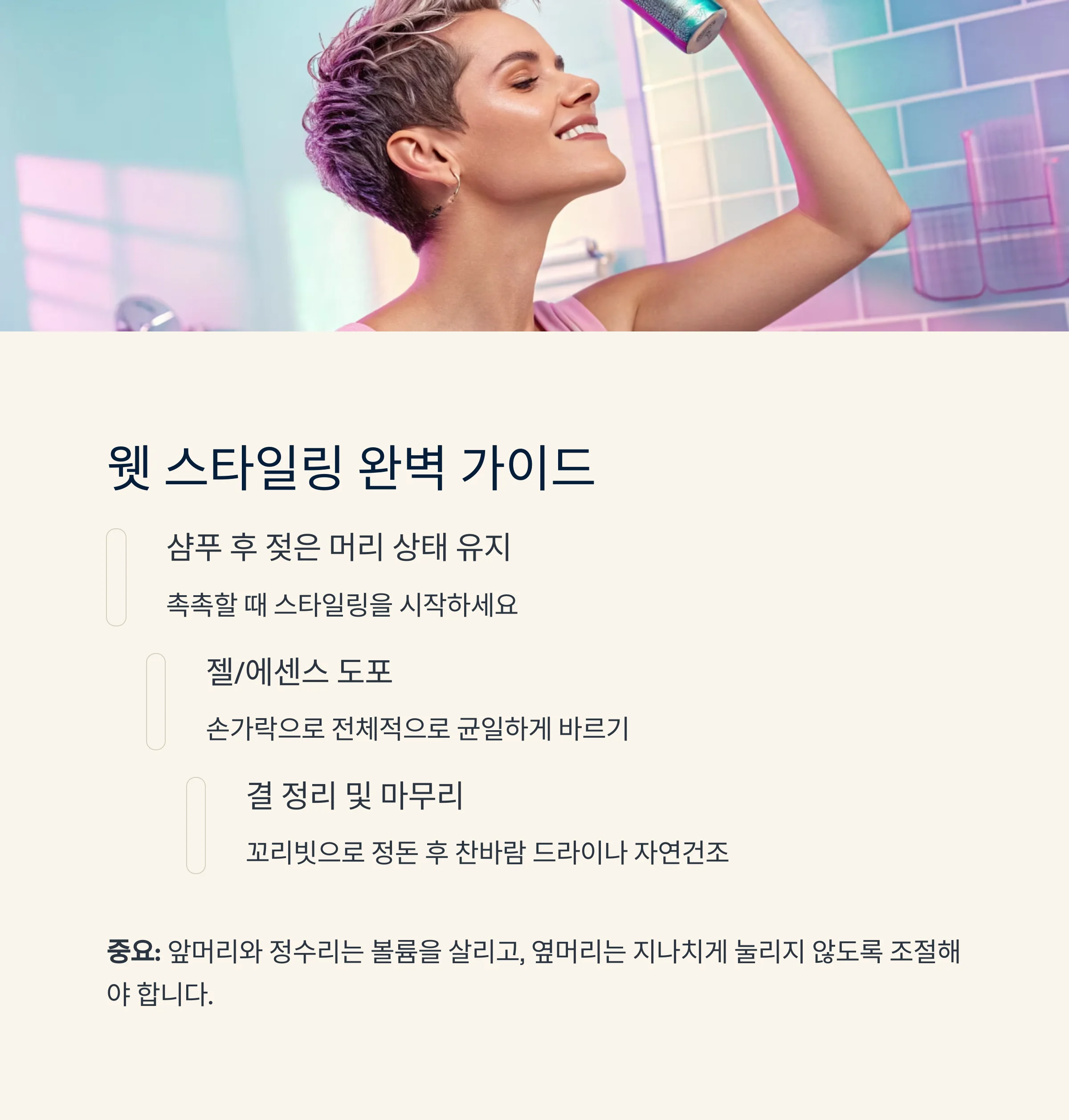 | 1 | 샴푸 후 젖은 머리 상태 유지 | 촉촉할 때 스타일링 시작 |